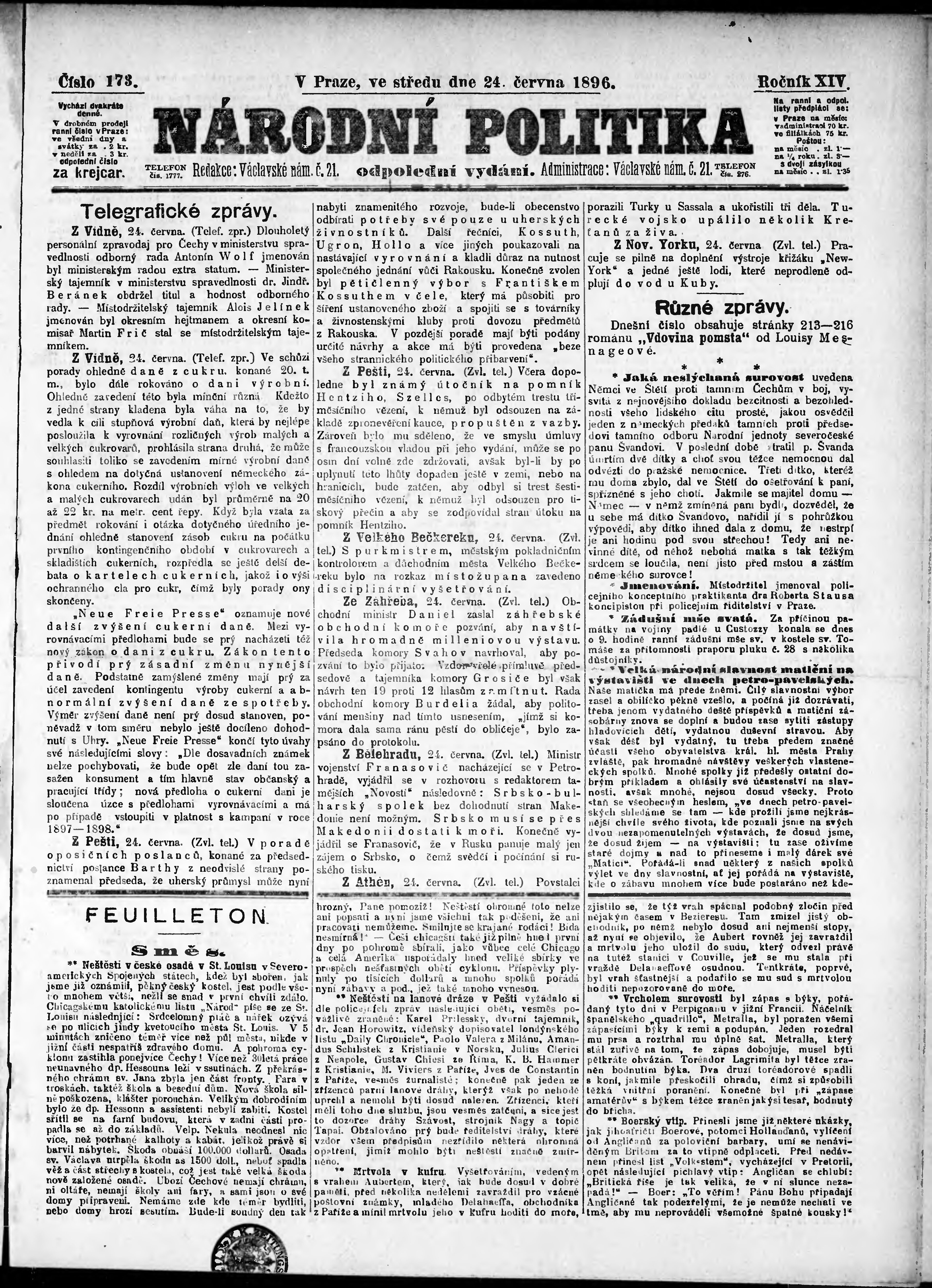 * Datum vydání výtisku: 24.6.1896 Číslo výtisku: 173 Poznámky k výtisku: odpolední vydání;