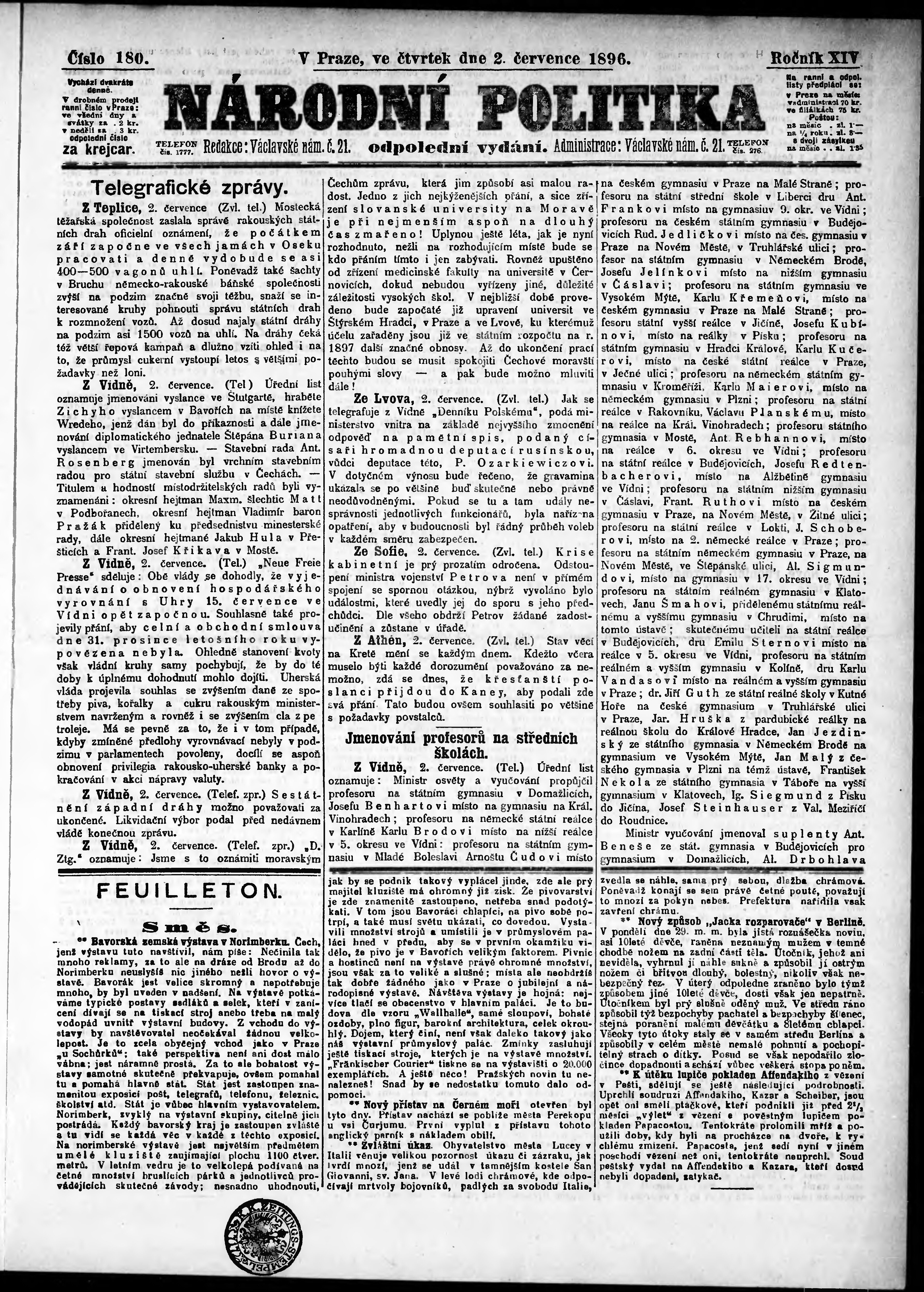 * Datum vydání výtisku: 2.7.1896 Číslo výtisku: 180 Poznámky k výtisku: odpolední vydání;