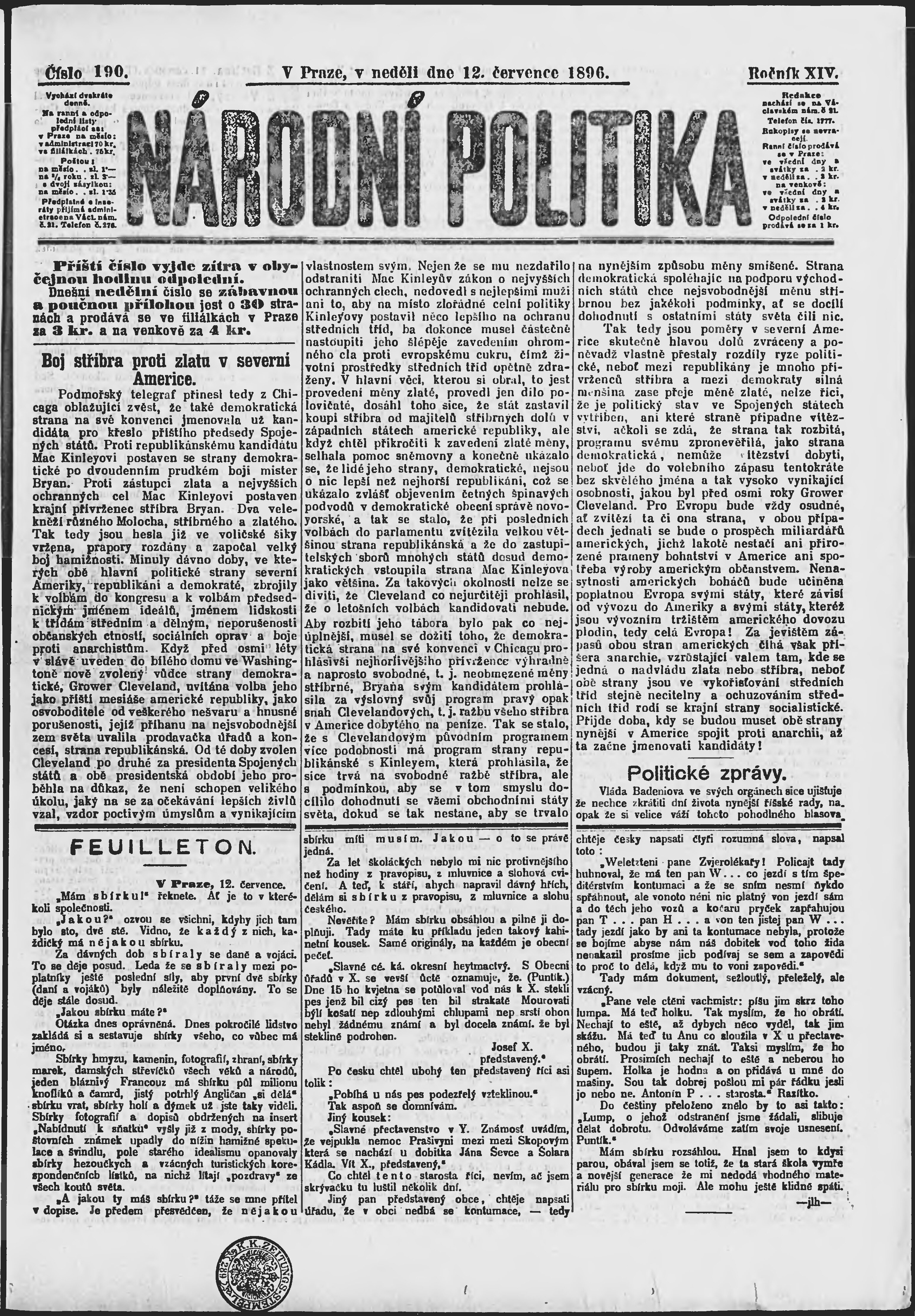 * Datum vydání výtisku: 12.7.1896 Číslo výtisku: 190 Poznámky k výtisku: ranní vydání;