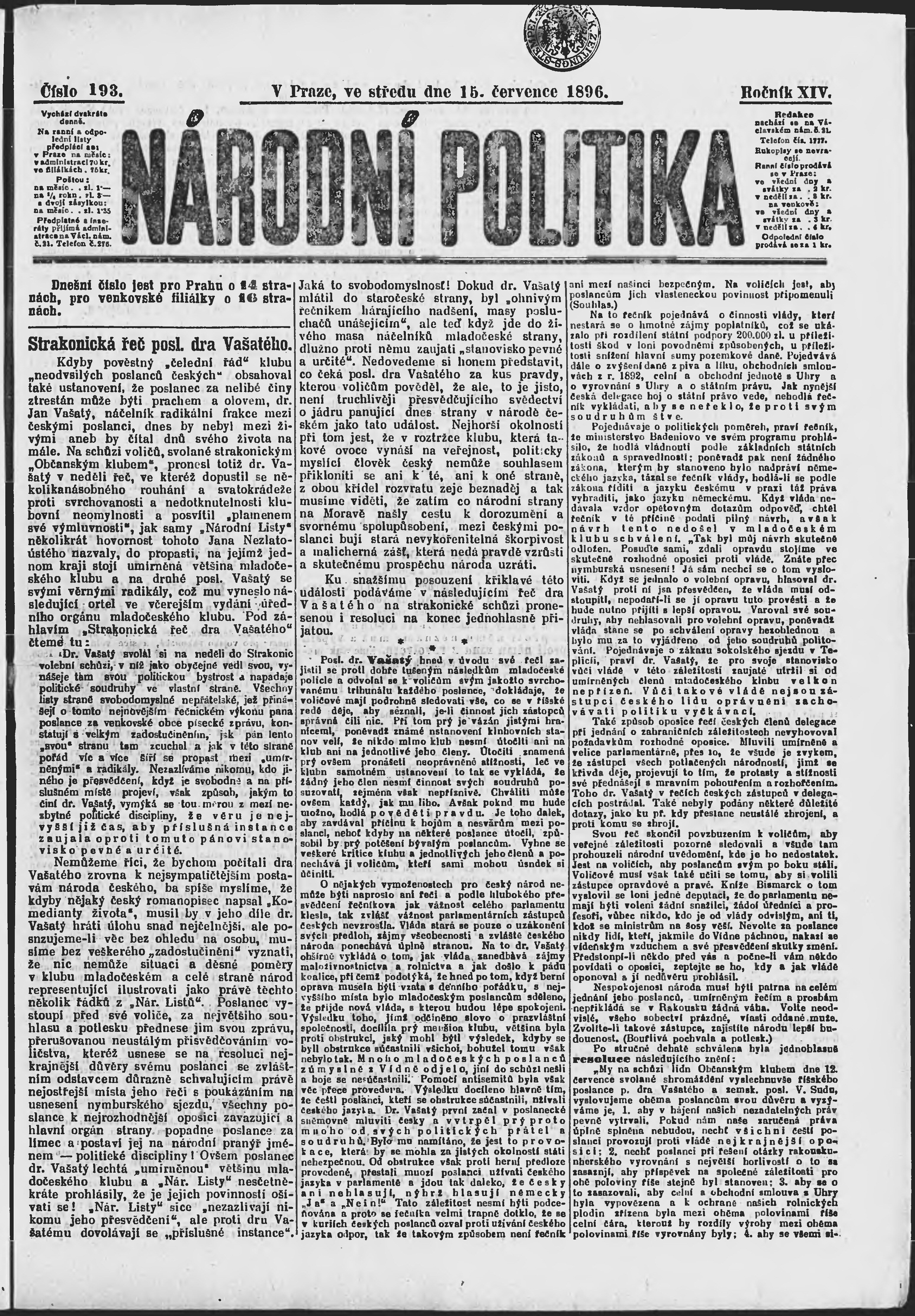 * Datum vydání výtisku: 15.7.1896 Číslo výtisku: 193 Poznámky k výtisku: ranní vydání;