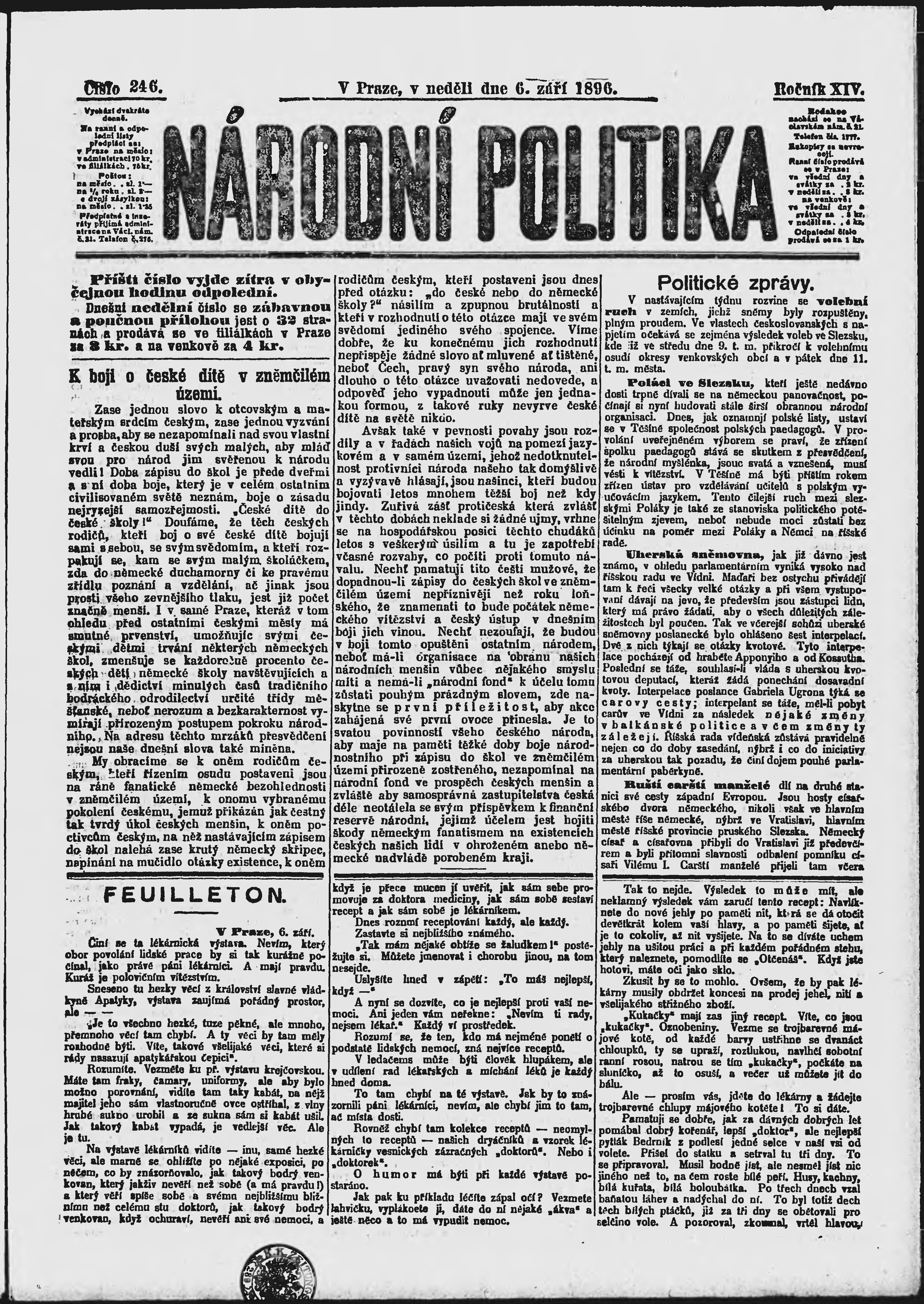 * Datum vydání výtisku: 6.9.1896 Číslo výtisku: 246 Poznámky k výtisku: ranní vydání;