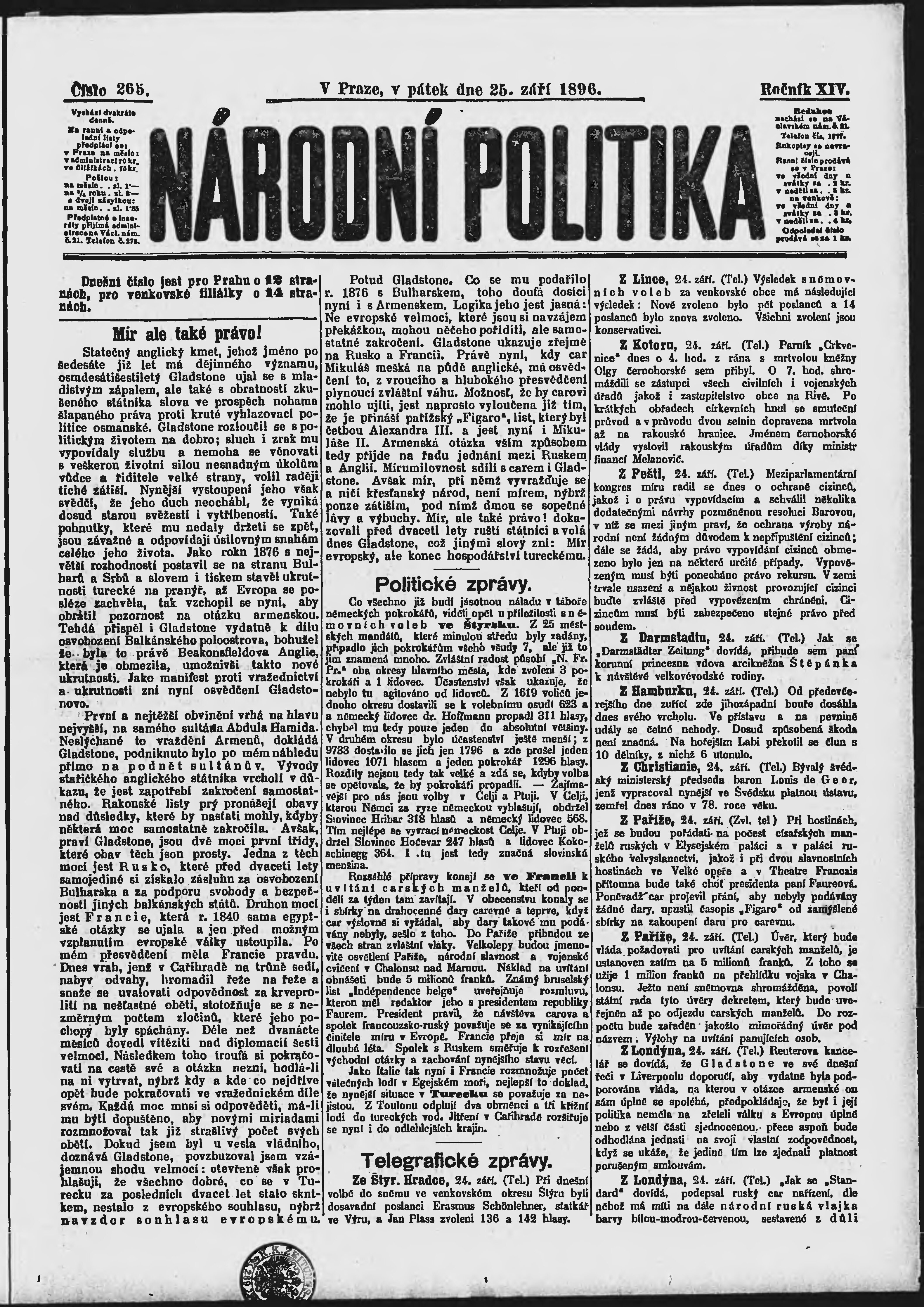 * Datum vydání výtisku: 25.9.1896 Číslo výtisku: 265 Poznámky k výtisku: ranní vydání;