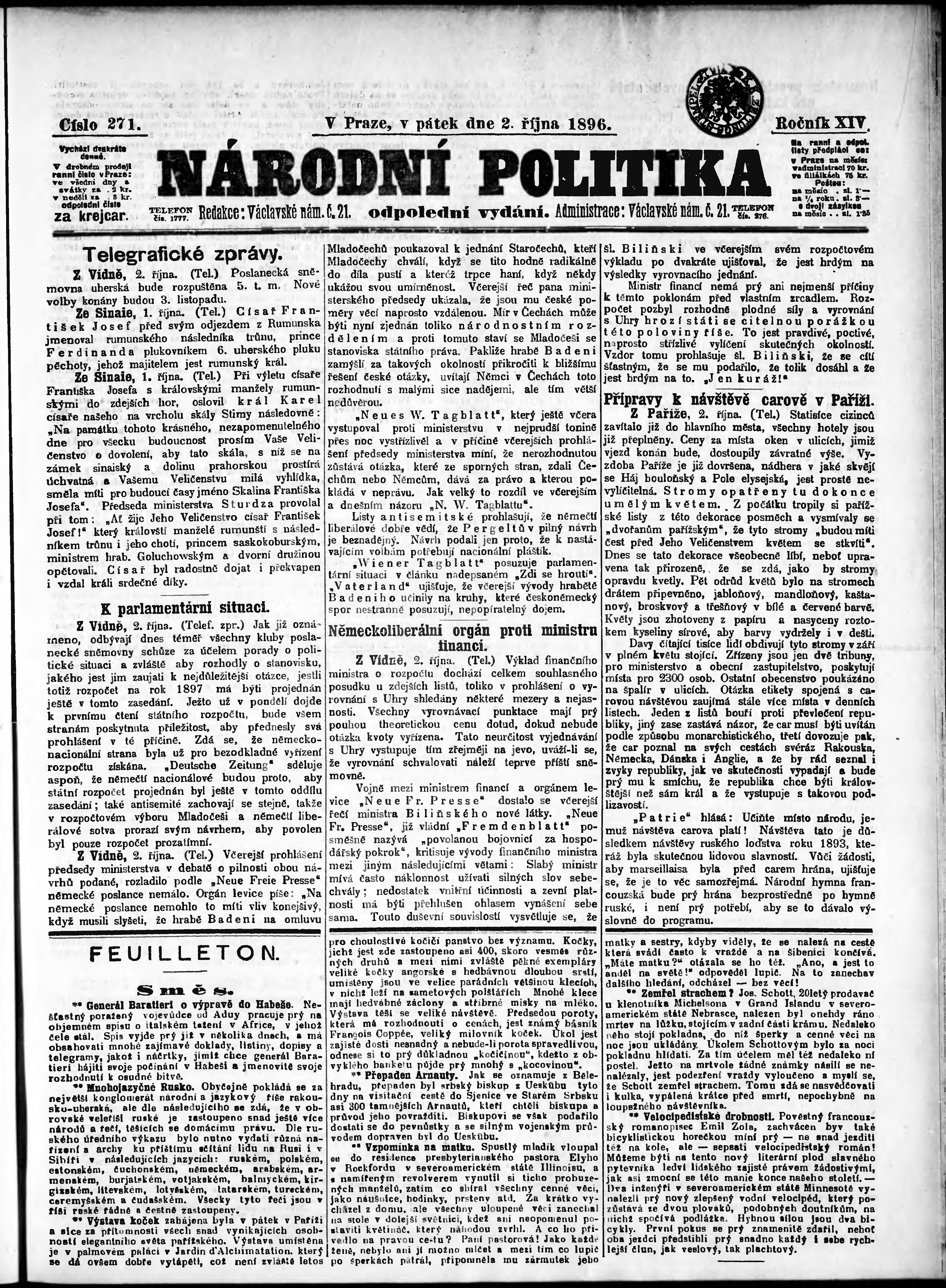 * Datum vydání výtisku: 2.10.1896 Číslo výtisku: 271 Poznámky k výtisku: odpolední vydání;