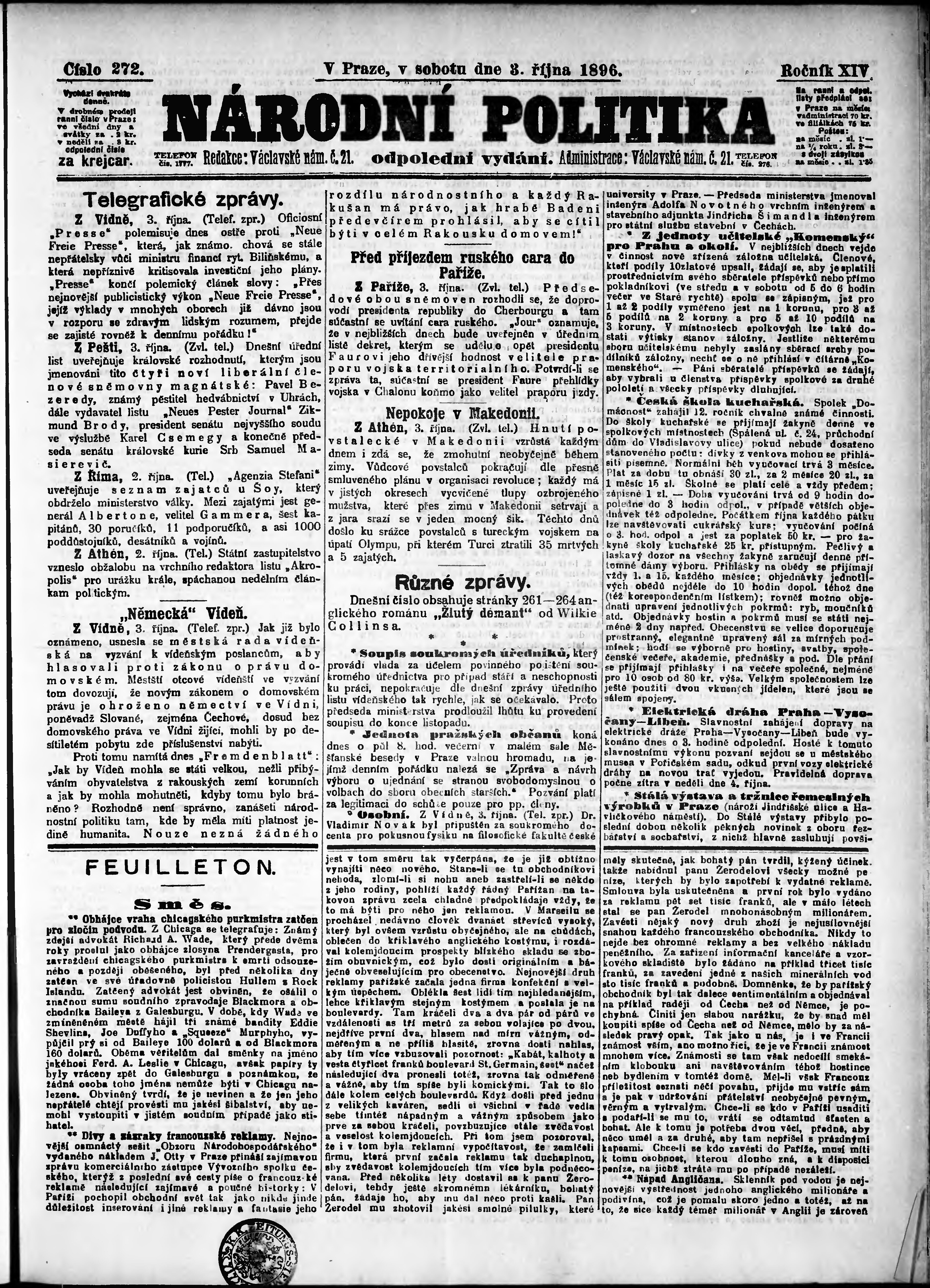 * Datum vydání výtisku: 3.10.1896 Číslo výtisku: 272 Poznámky k výtisku: odpolední vydání;