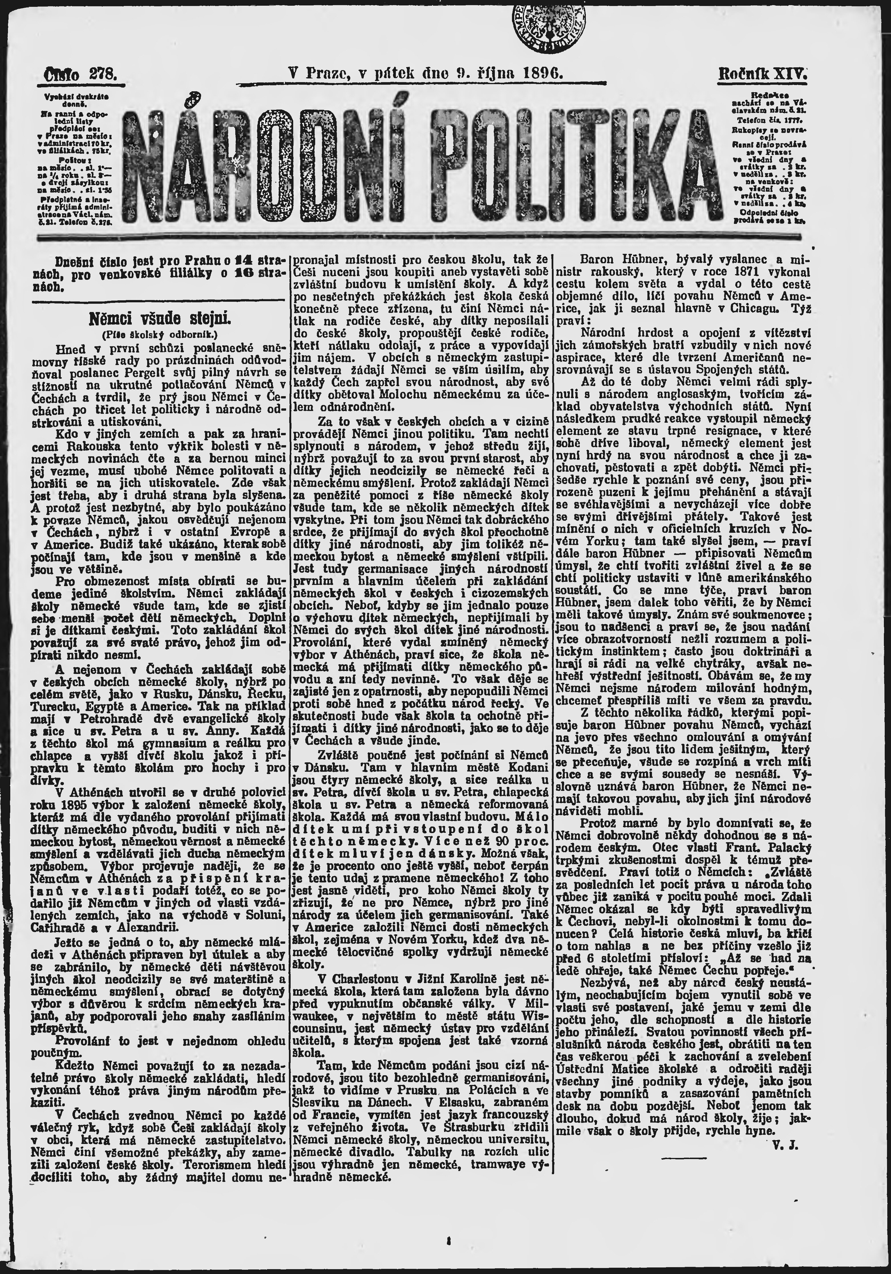 * Datum vydání výtisku: 9.10.1896 Číslo výtisku: 278 Poznámky k výtisku: ranní vydání;