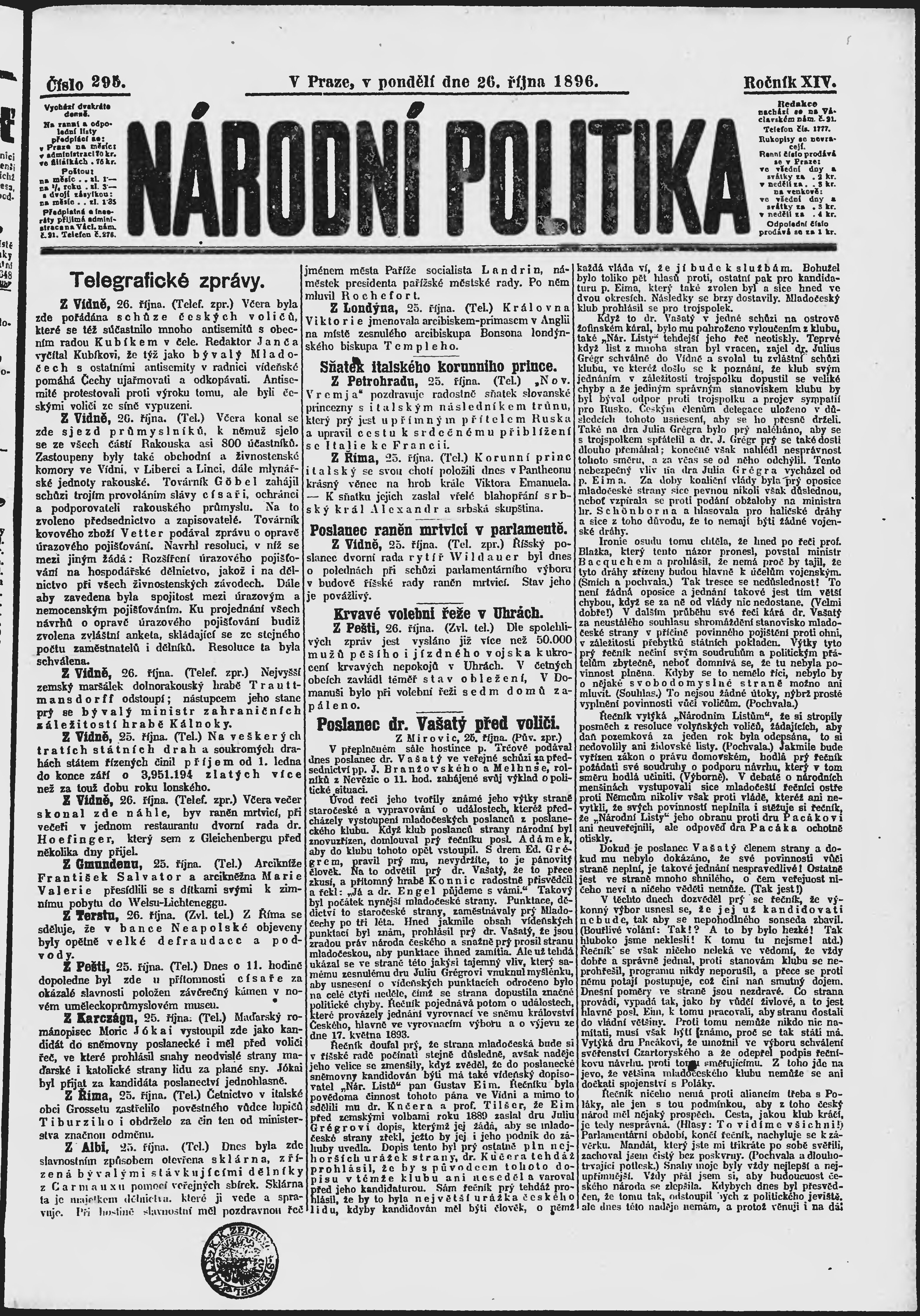 * Datum vydání výtisku: 26.10.1896 Číslo výtisku: 295 Poznámky k výtisku: ranní vydání;