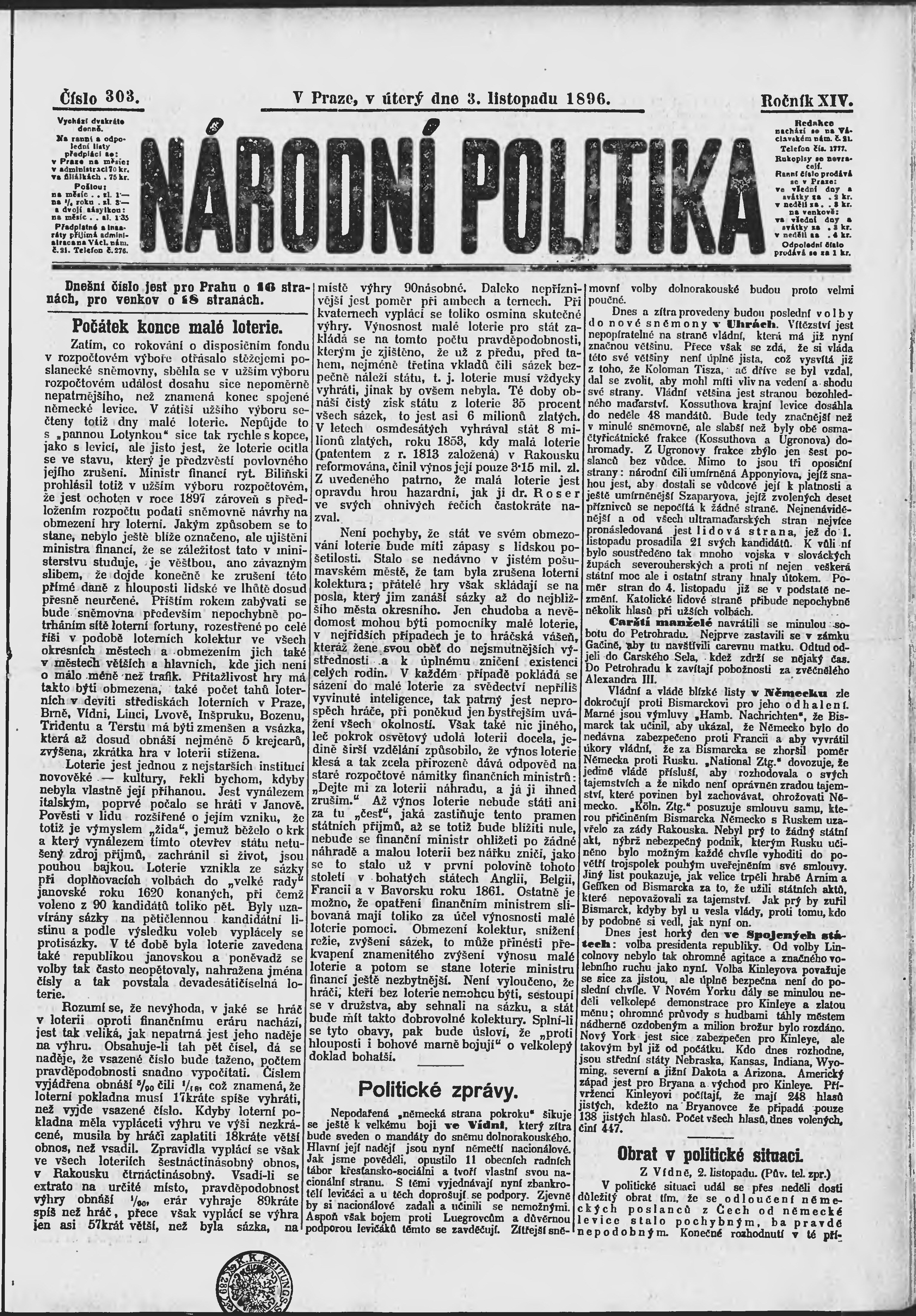 * Datum vydání výtisku: 3.11.1896 Číslo výtisku: 303 Poznámky k výtisku: ranní vydání;