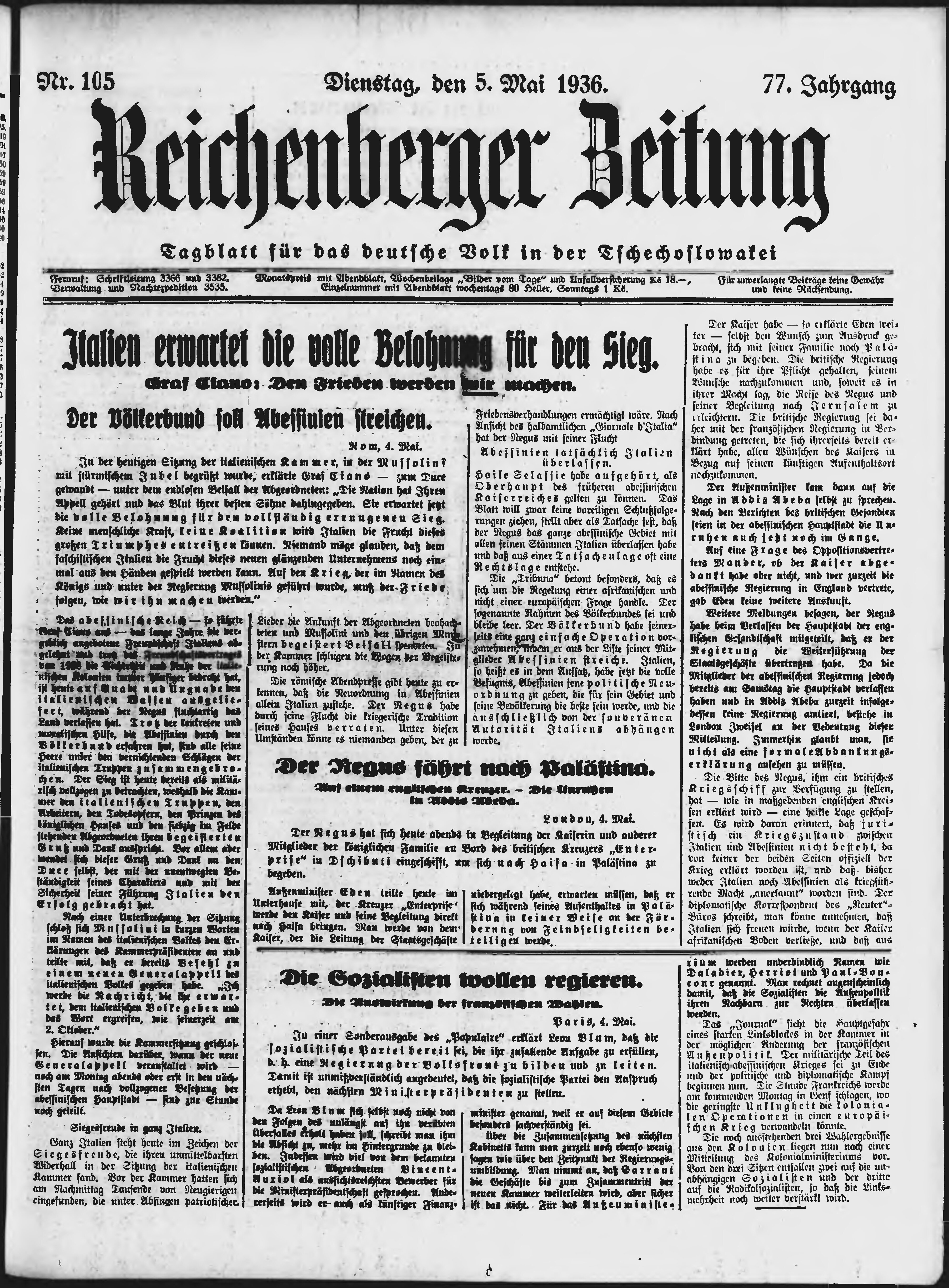 * Datum vydání výtisku: 5.5.1936 Číslo výtisku: 105 Poznámky k výtisku: ranní vydání;