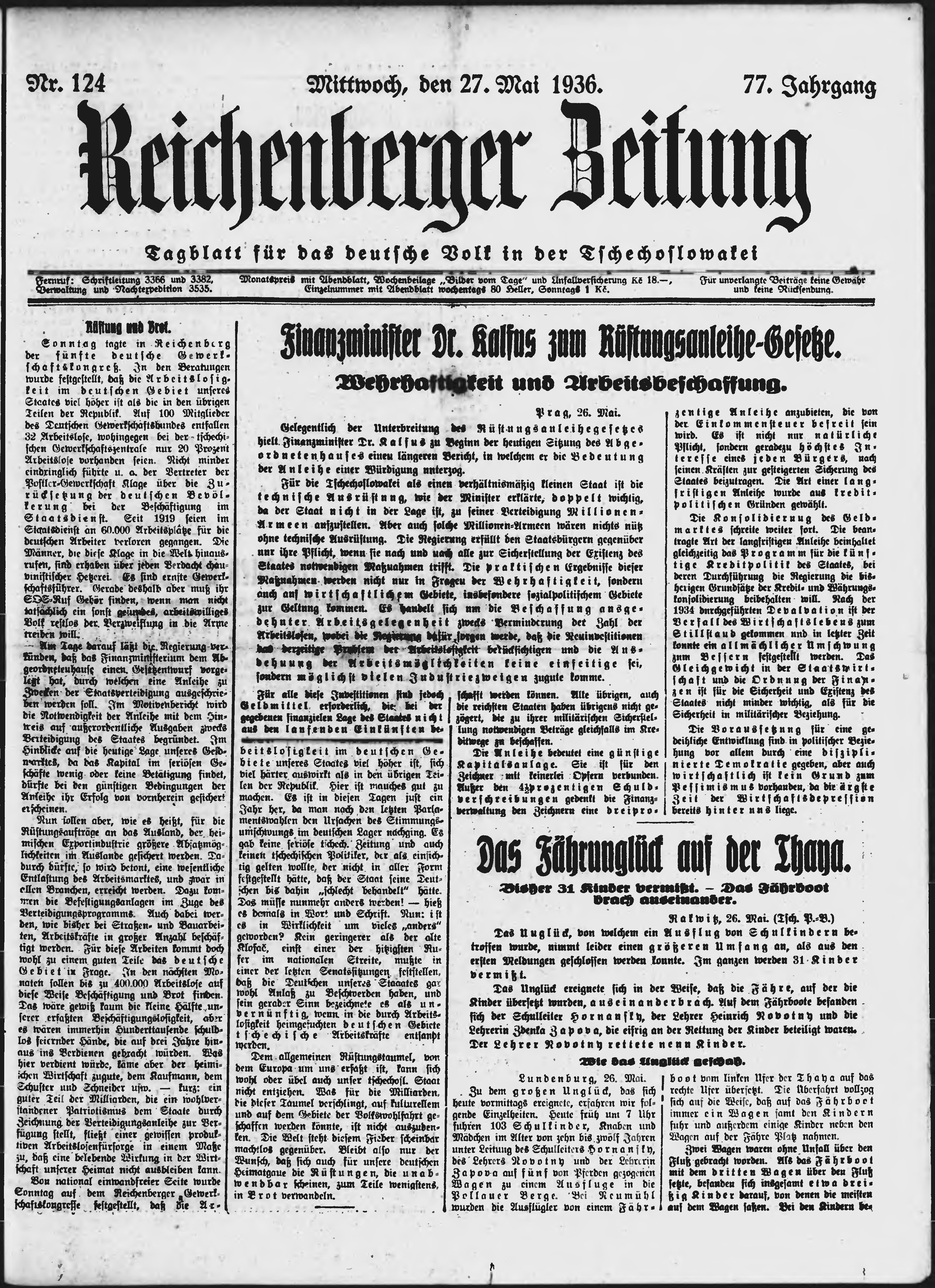 * Datum vydání výtisku: 27.5.1936 Číslo výtisku: 124 Poznámky k výtisku: ranní vydání;