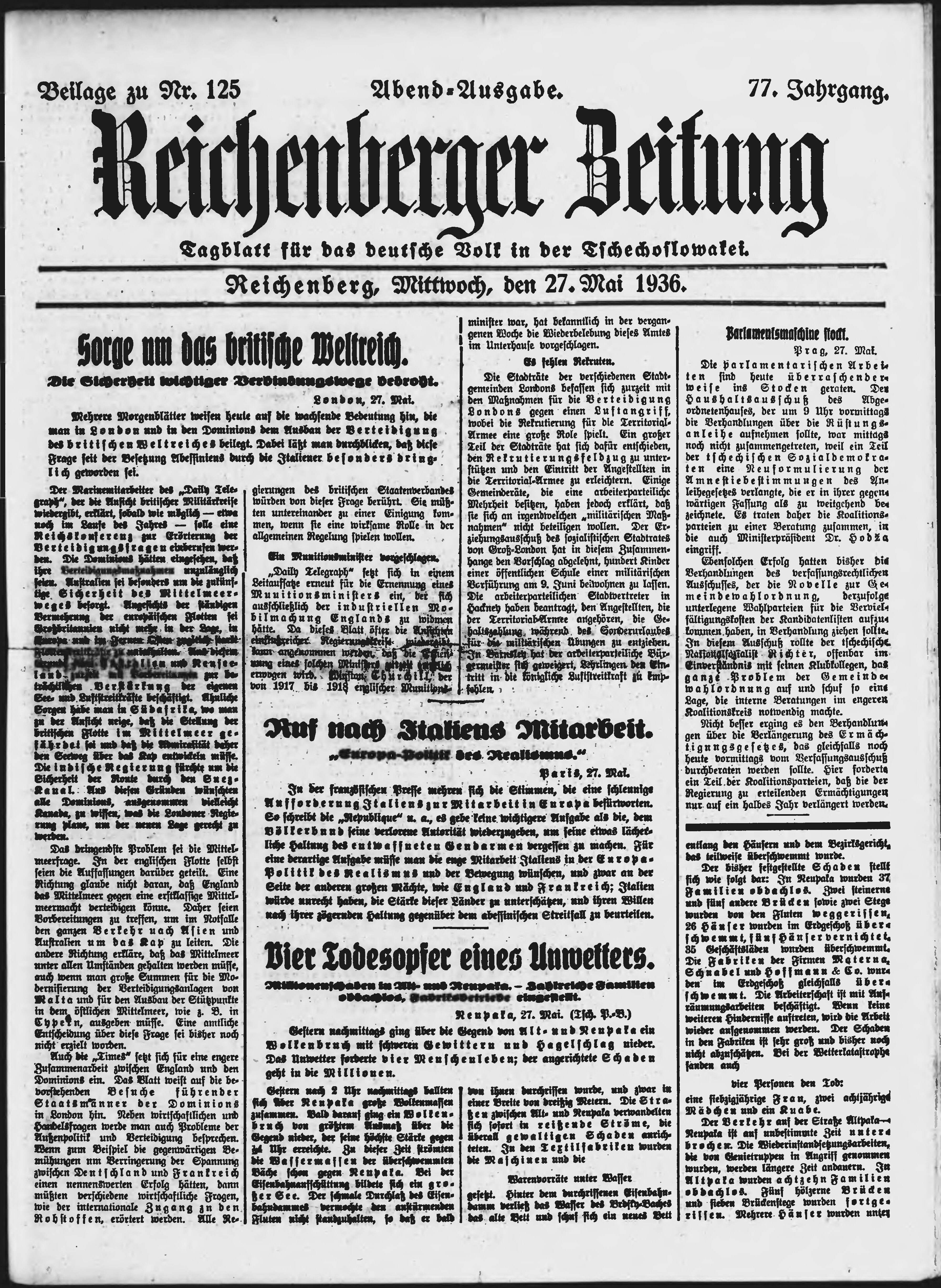 * Datum vydání výtisku: 27.5.1936 Číslo výtisku: 125 Typ výtisku: příloha Poznámky k výtisku: večerní vydání;