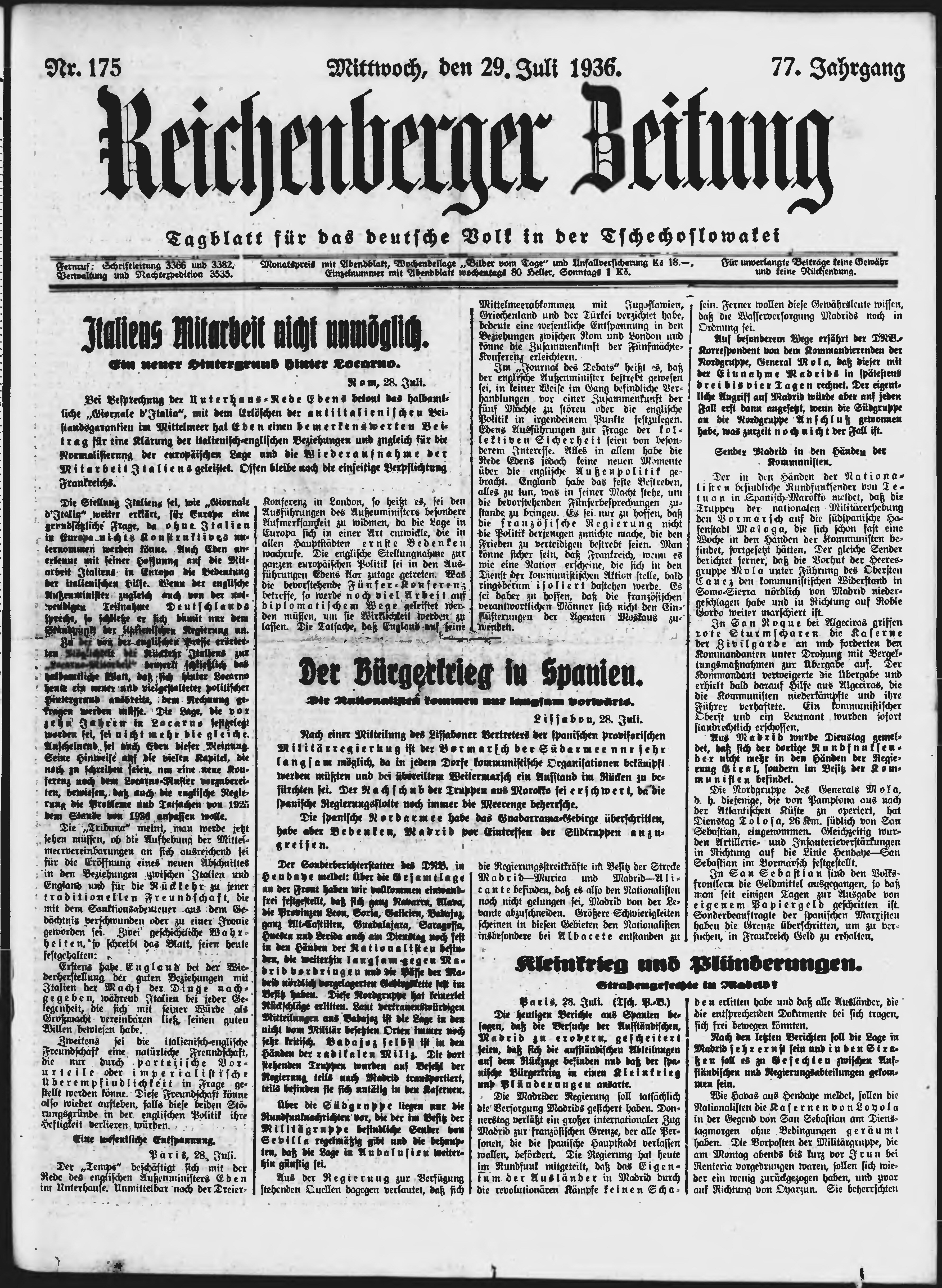 * Datum vydání výtisku: 29.7.1936 Číslo výtisku: 175 Poznámky k výtisku: ranní vydání;