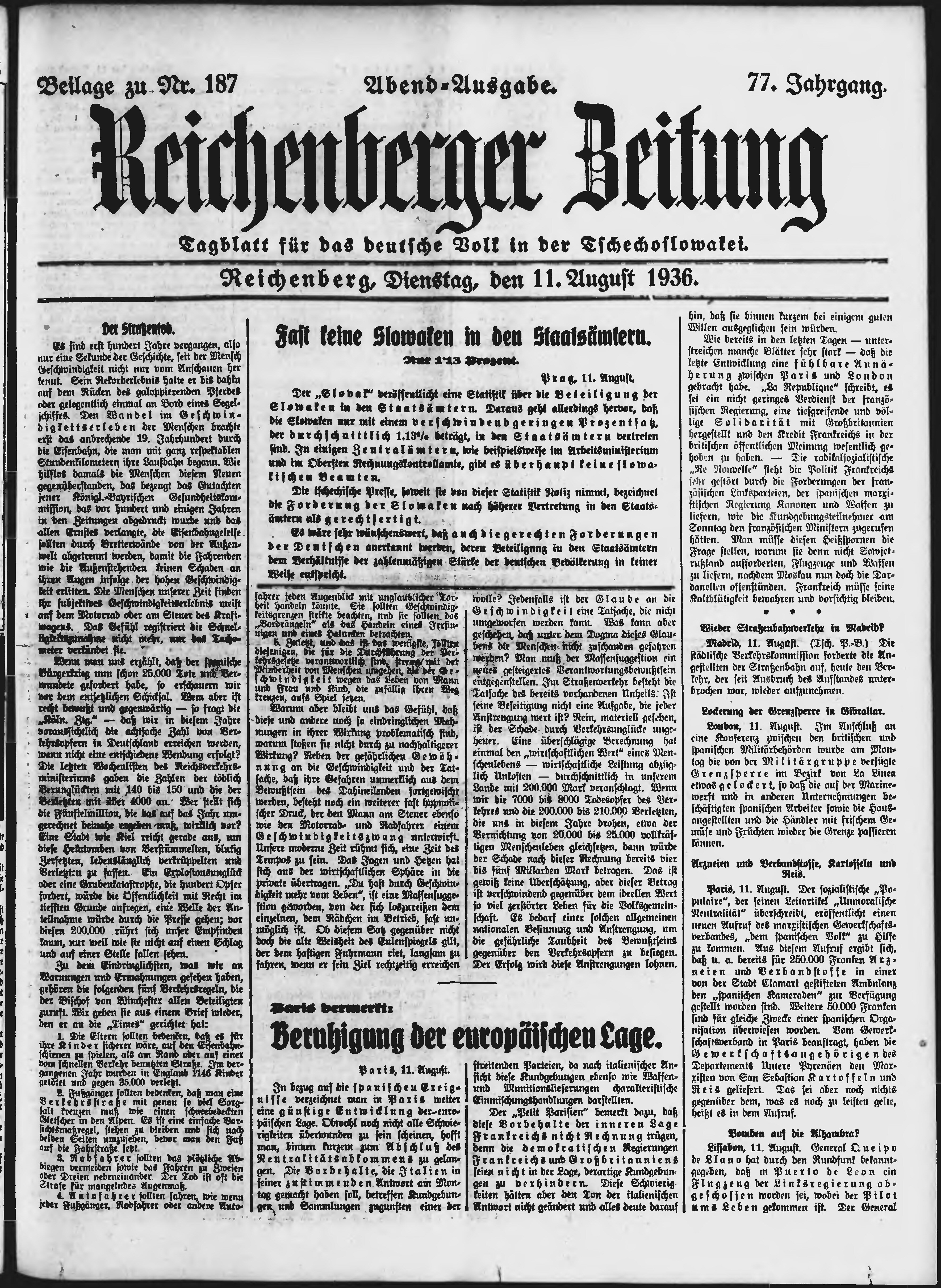 * Datum vydání výtisku: 11.8.1936 Číslo výtisku: 187 Typ výtisku: příloha Poznámky k výtisku: večerní vydání;