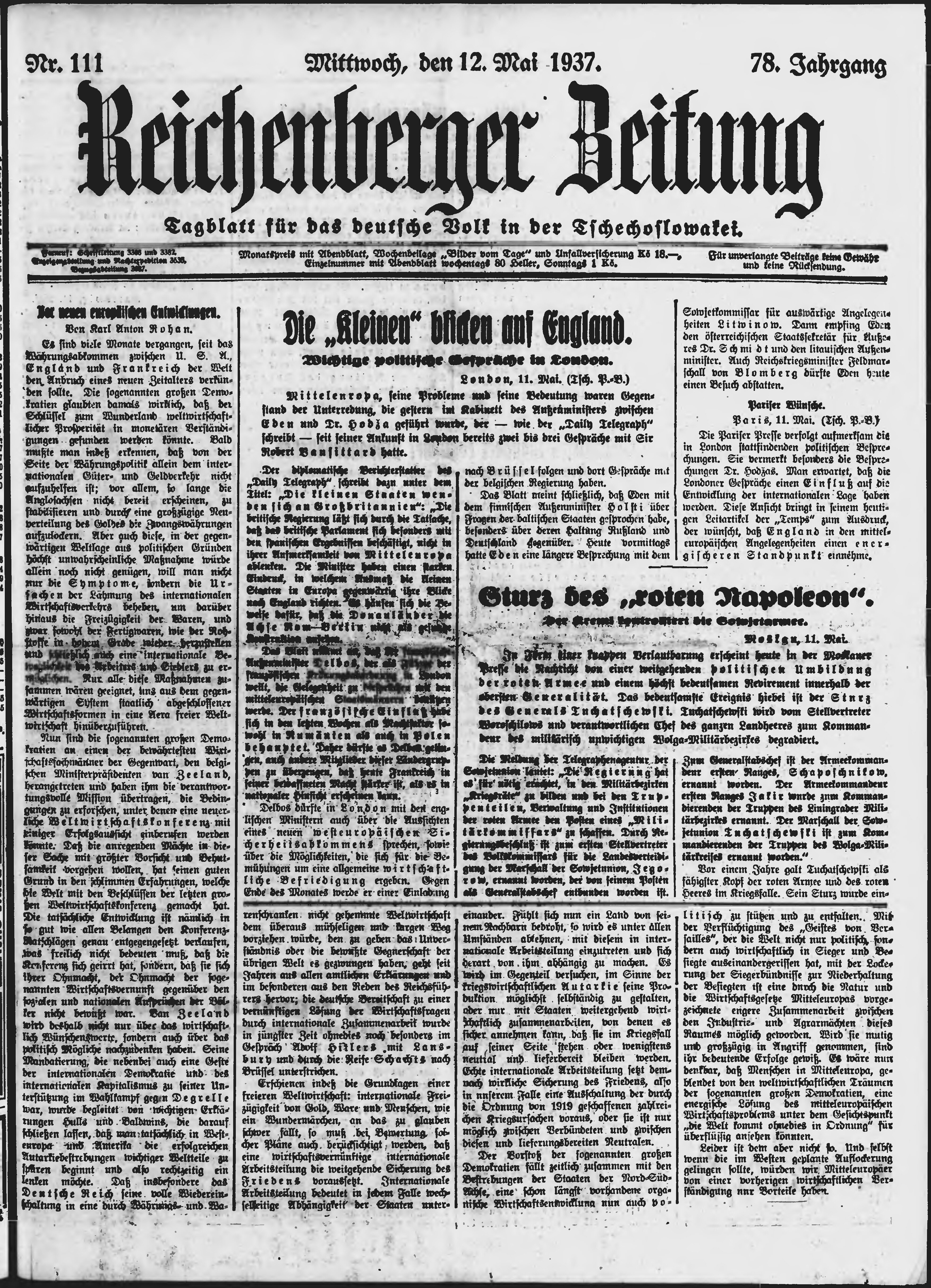 * Datum vydání výtisku: 12.5.1937 Číslo výtisku: 111 Poznámky k výtisku: ranní vydání;