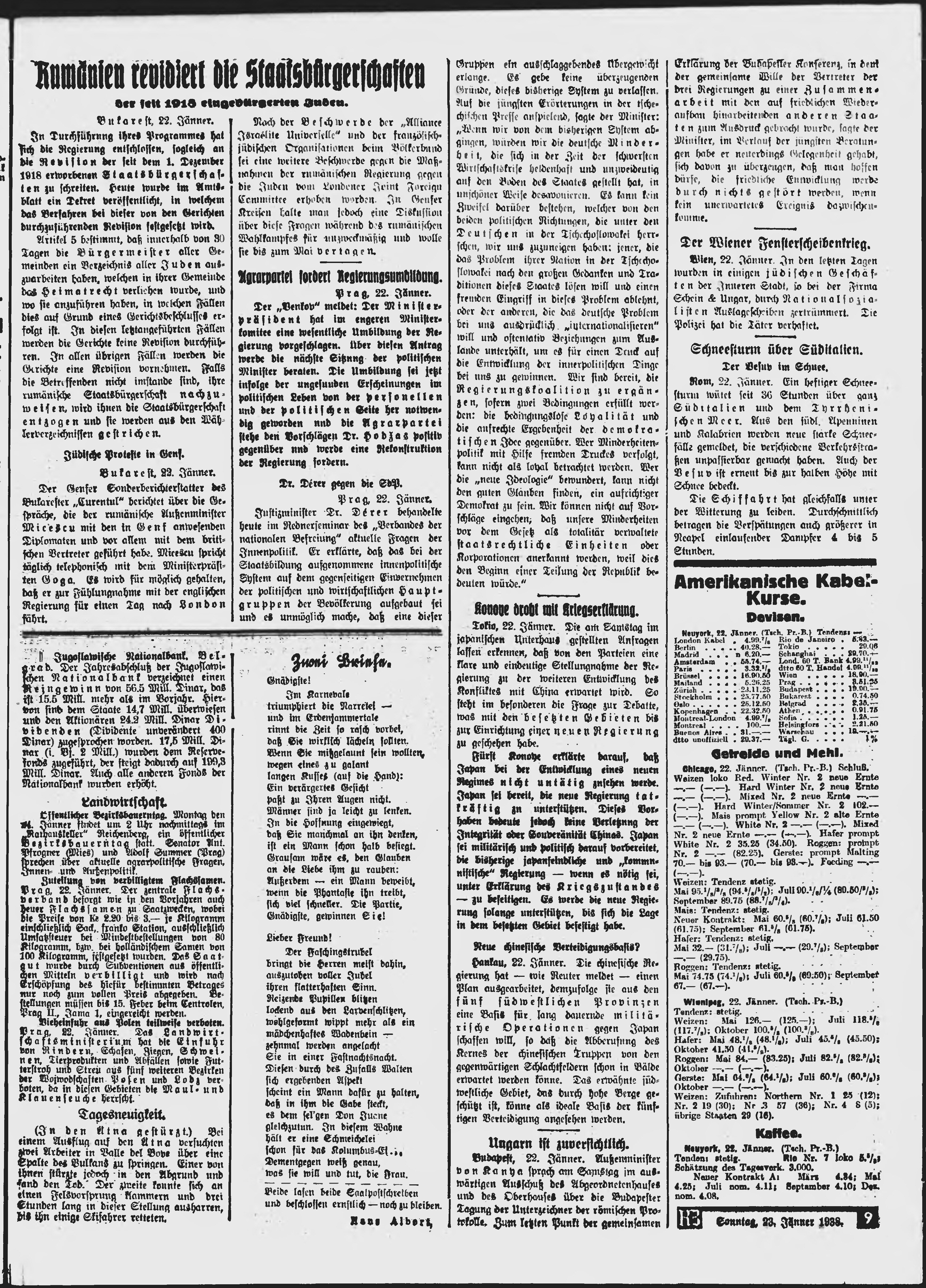 * Datum vydání výtisku: 23.1.1938 Číslo výtisku: 19 Poznámky k výtisku: ranní vydání;