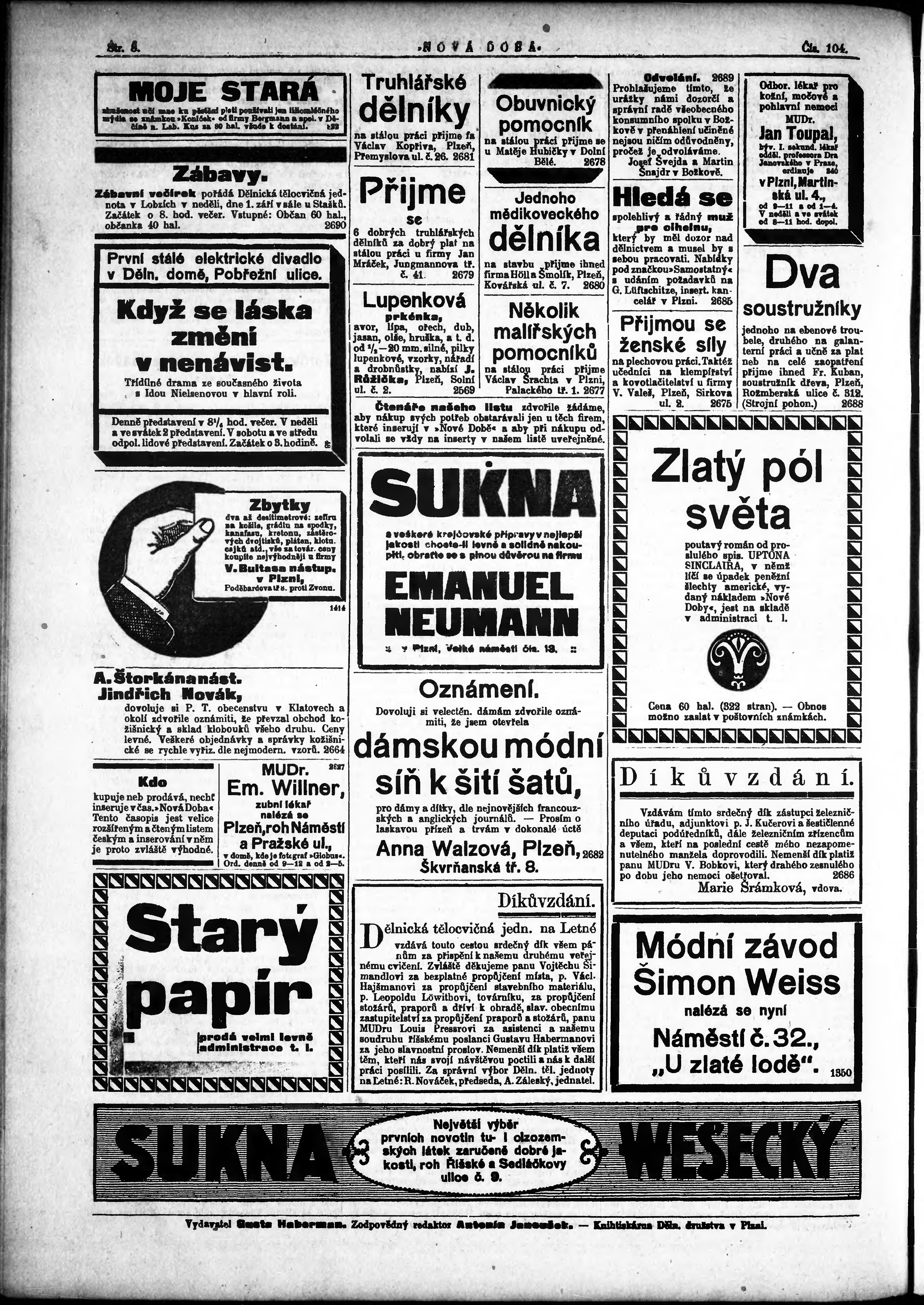 * Datum vydání výtisku: 28.8.1912 Číslo výtisku: 104 Poznámky k výtisku: po konfiskaci nové vydání;