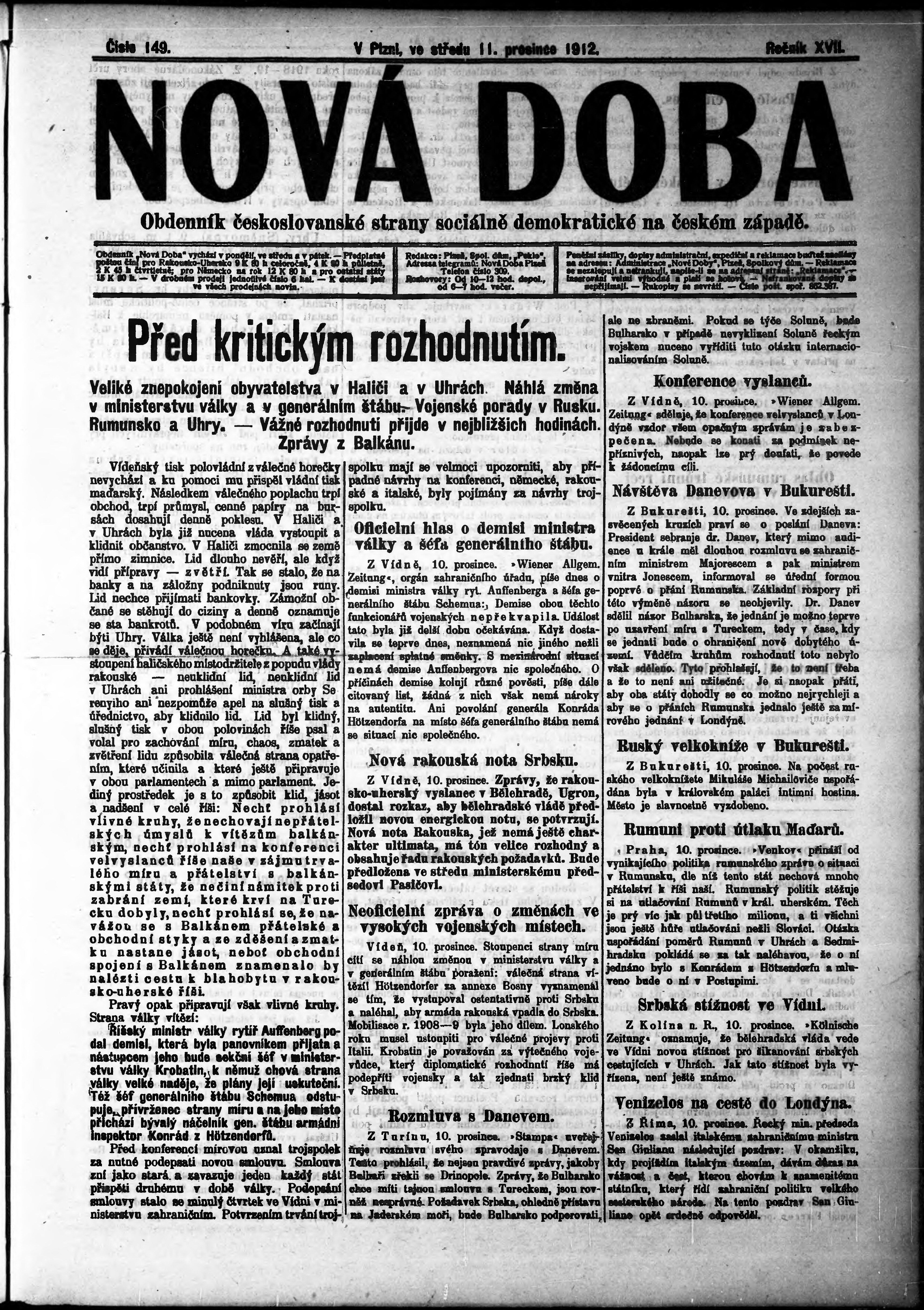 * Datum vydání výtisku: 11.12.1912 Číslo výtisku: 149