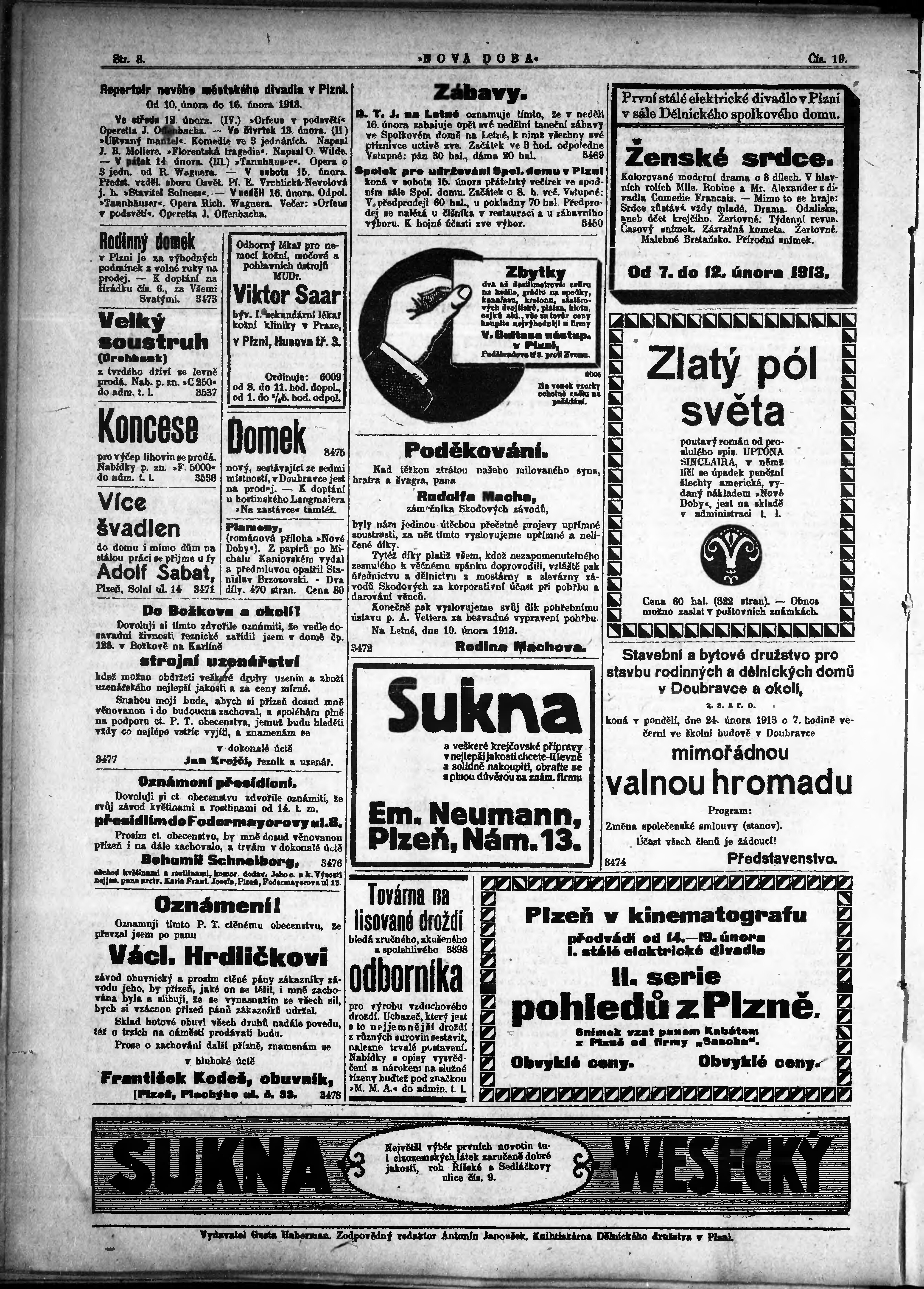 * Datum vydání výtisku: 12.2.1913 Číslo výtisku: 19