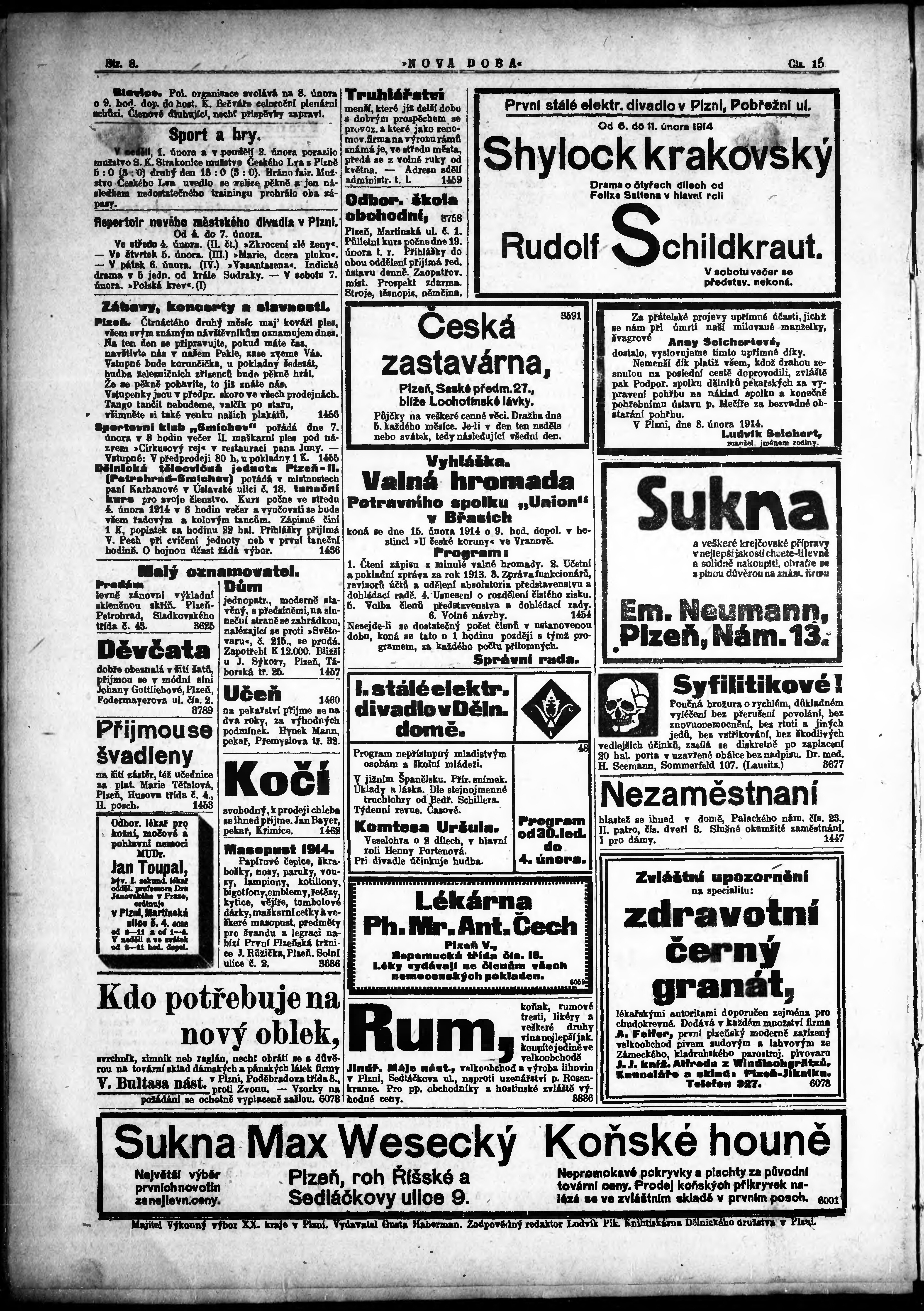* Datum vydání výtisku: 4.2.1914 Číslo výtisku: 15