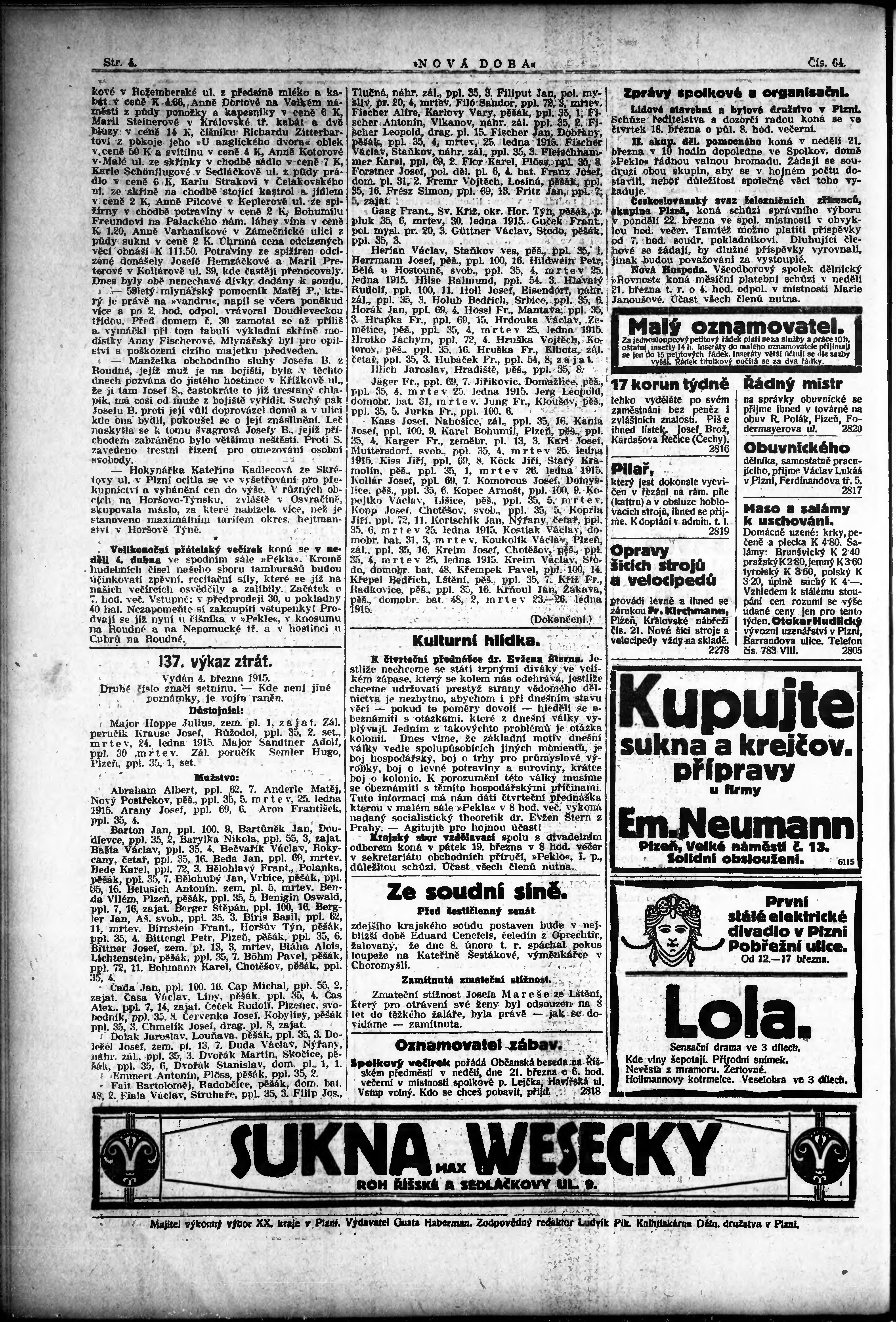 * Datum vydání výtisku: 17.3.1915 Číslo výtisku: 64