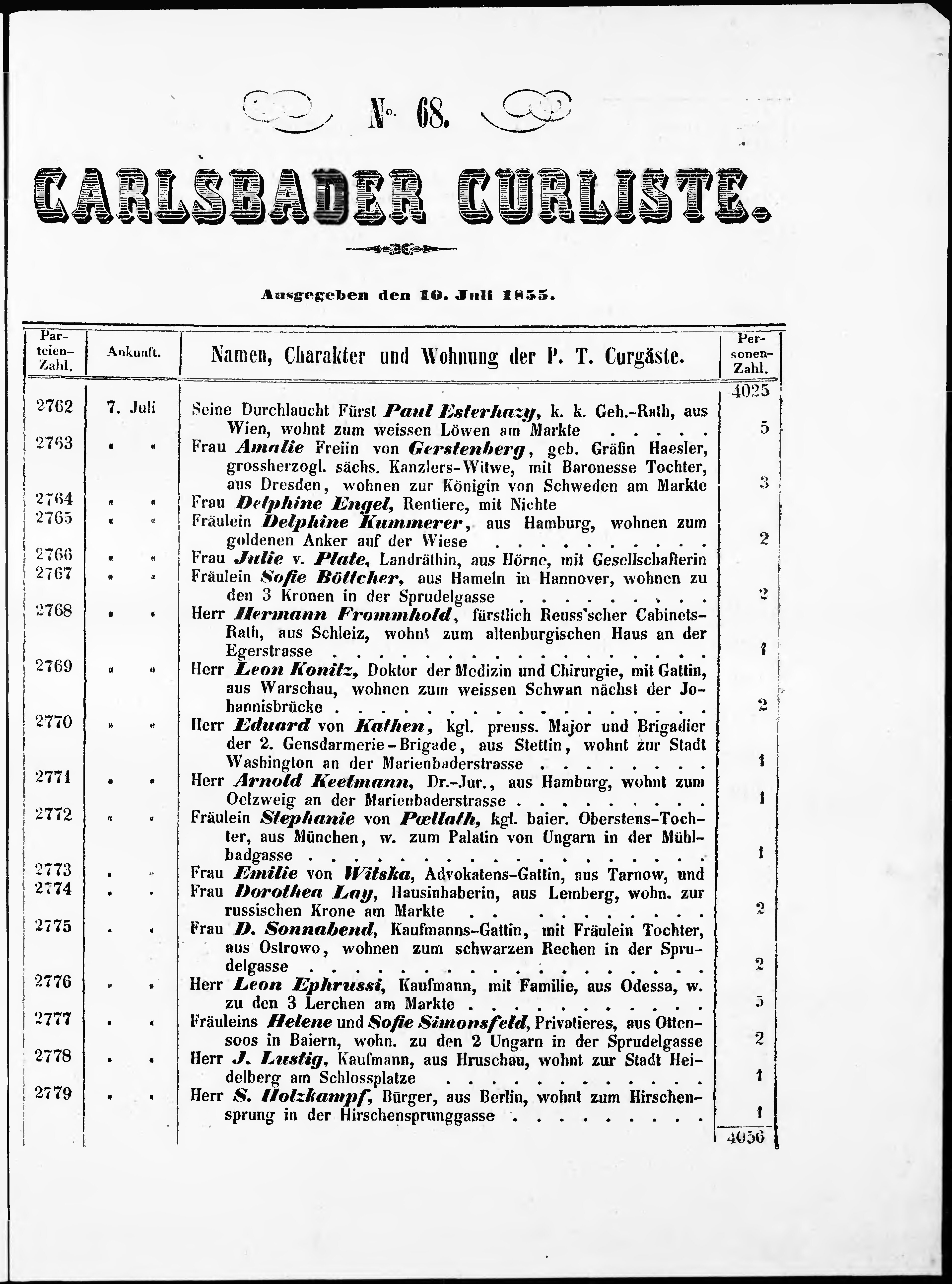 Liste der im Jahre ... angekommenen und abgereisten Kur- und Badegäste in Karlsb...