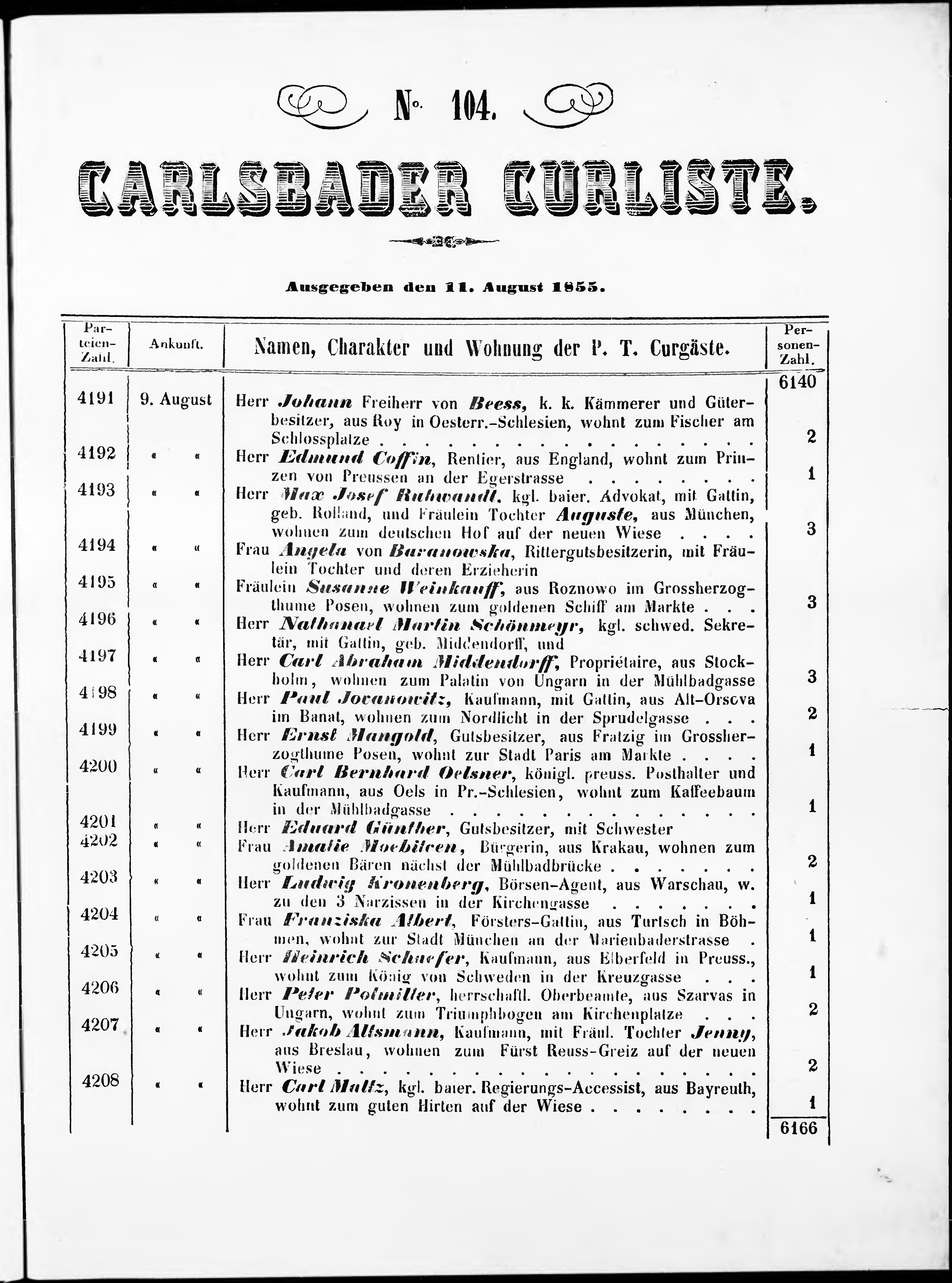 * Datum vydání výtisku: 11.8.1855 Číslo výtisku: 104