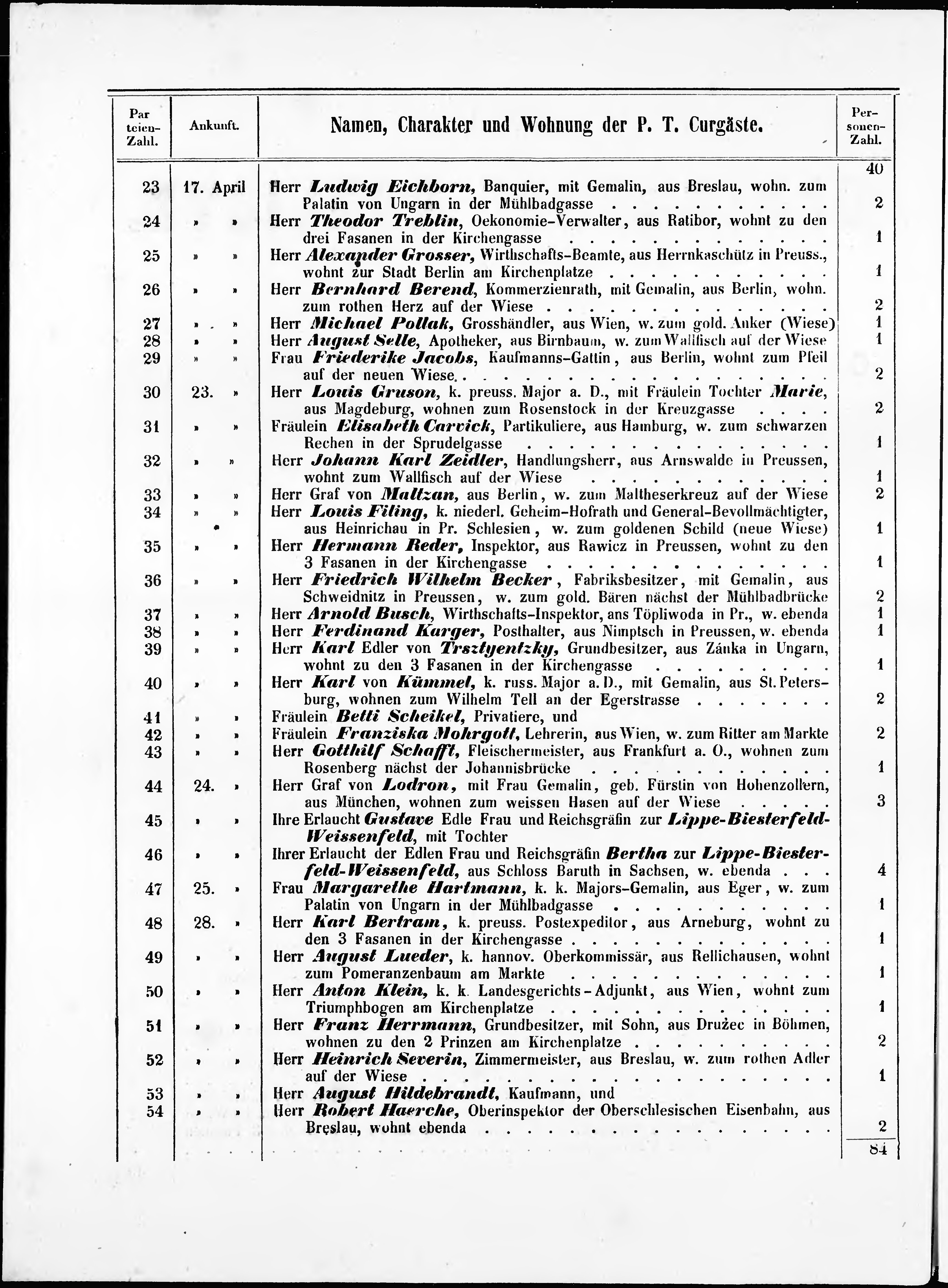 Liste der im Jahre ... angekommenen und abgereisten Kur- und Badegäste in Carlsb...
