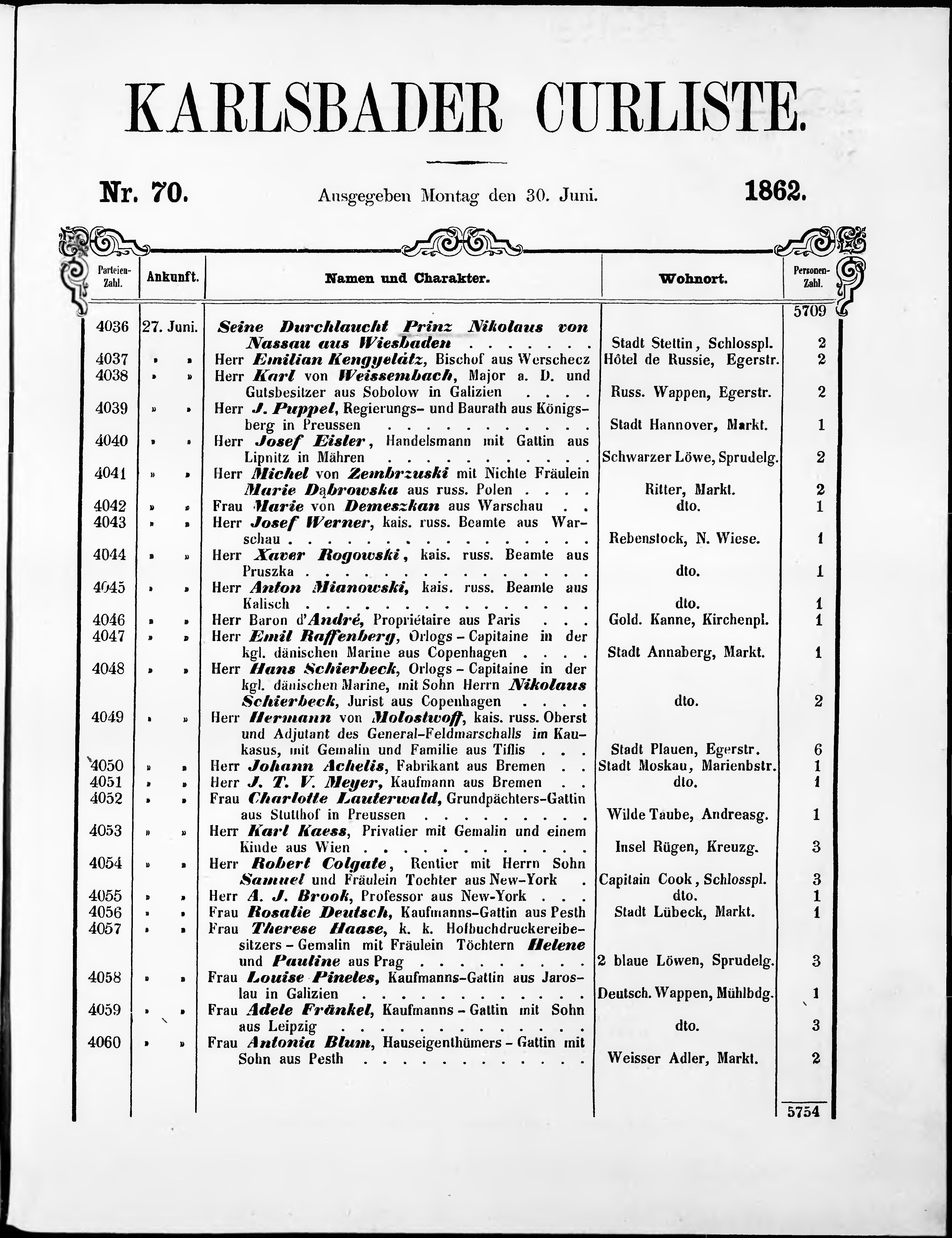 Liste der P.T. Curgäste in Carlsbad ...