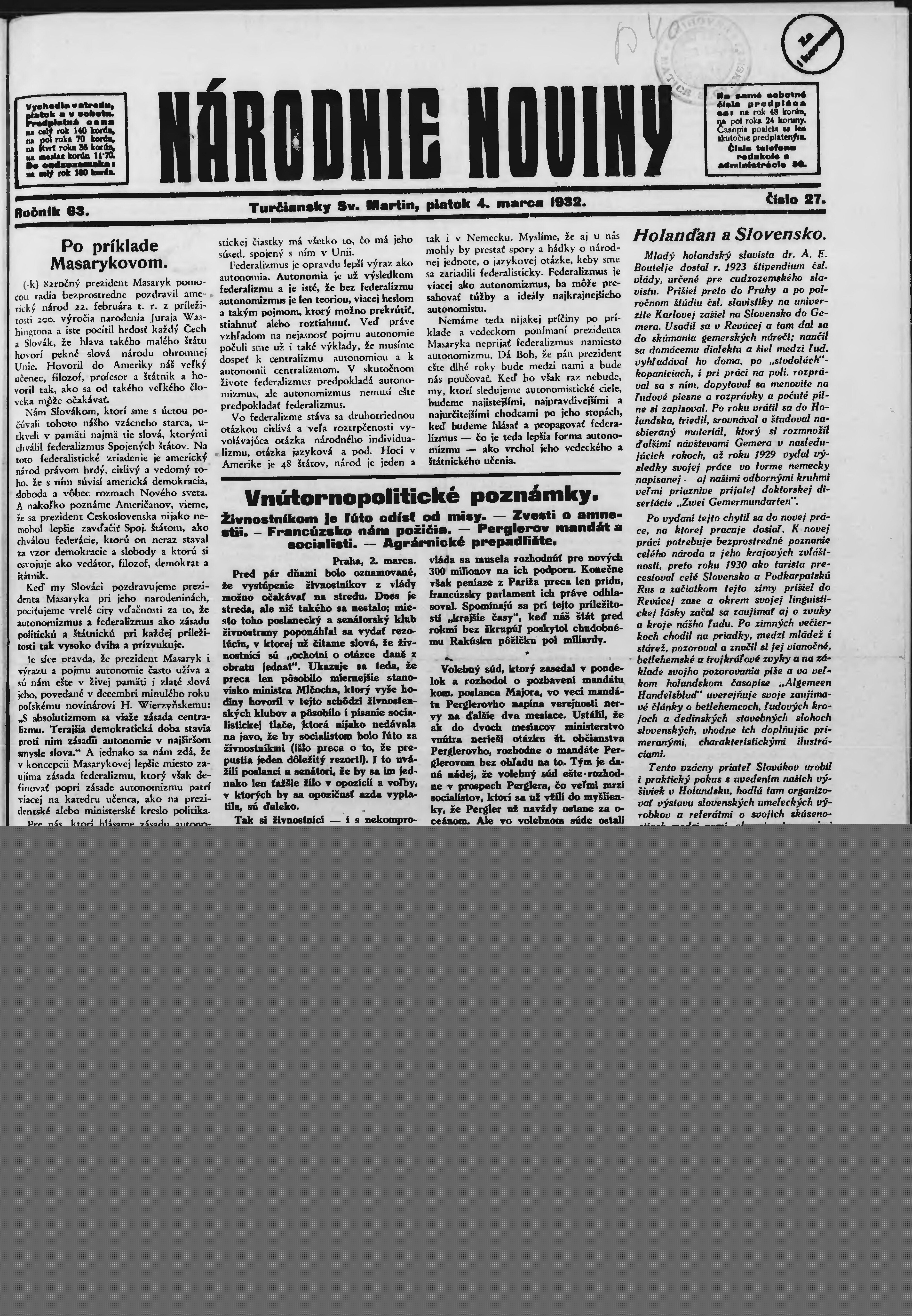 * Datum vydání výtisku: 4.3.1932 Číslo výtisku: 27