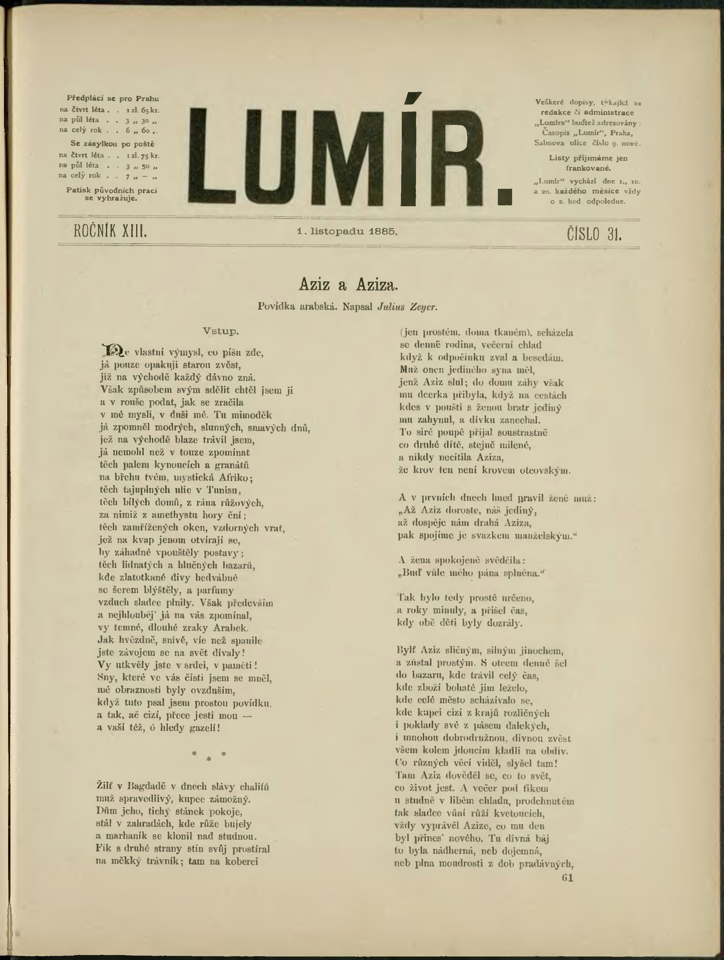 * Datum vydání výtisku: 1.11.1885 Číslo výtisku: 31