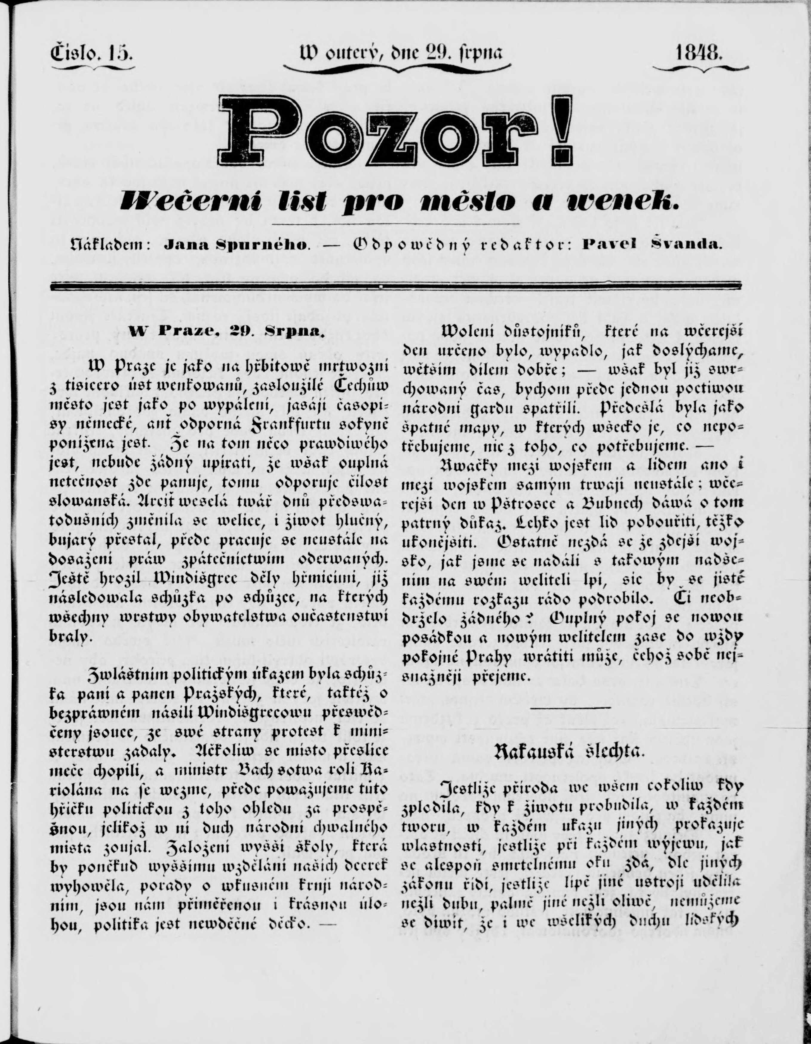 * Datum vydání výtisku: 29.8.1848 Číslo výtisku: 15