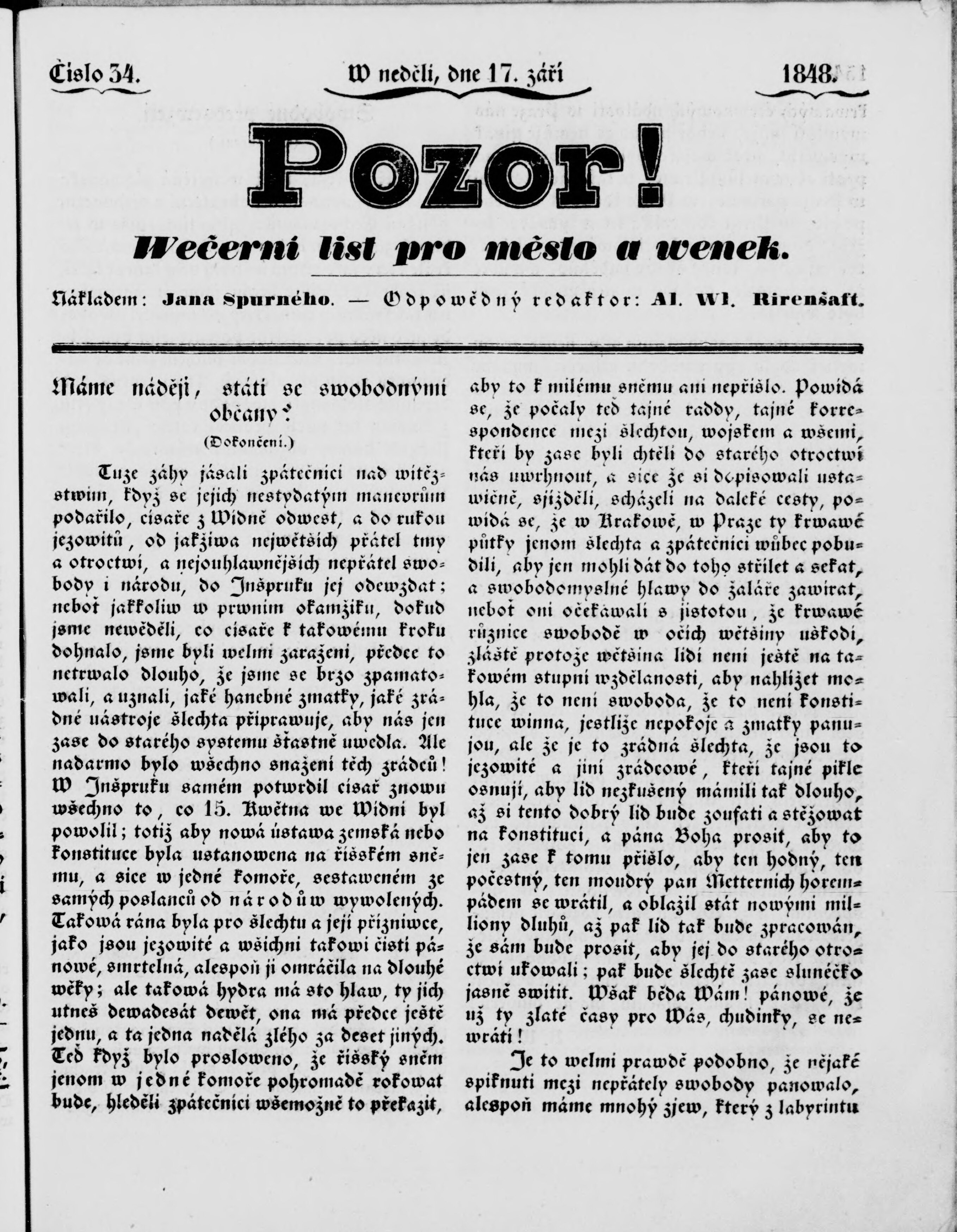 * Datum vydání výtisku: 17.9.1848 Číslo výtisku: 34