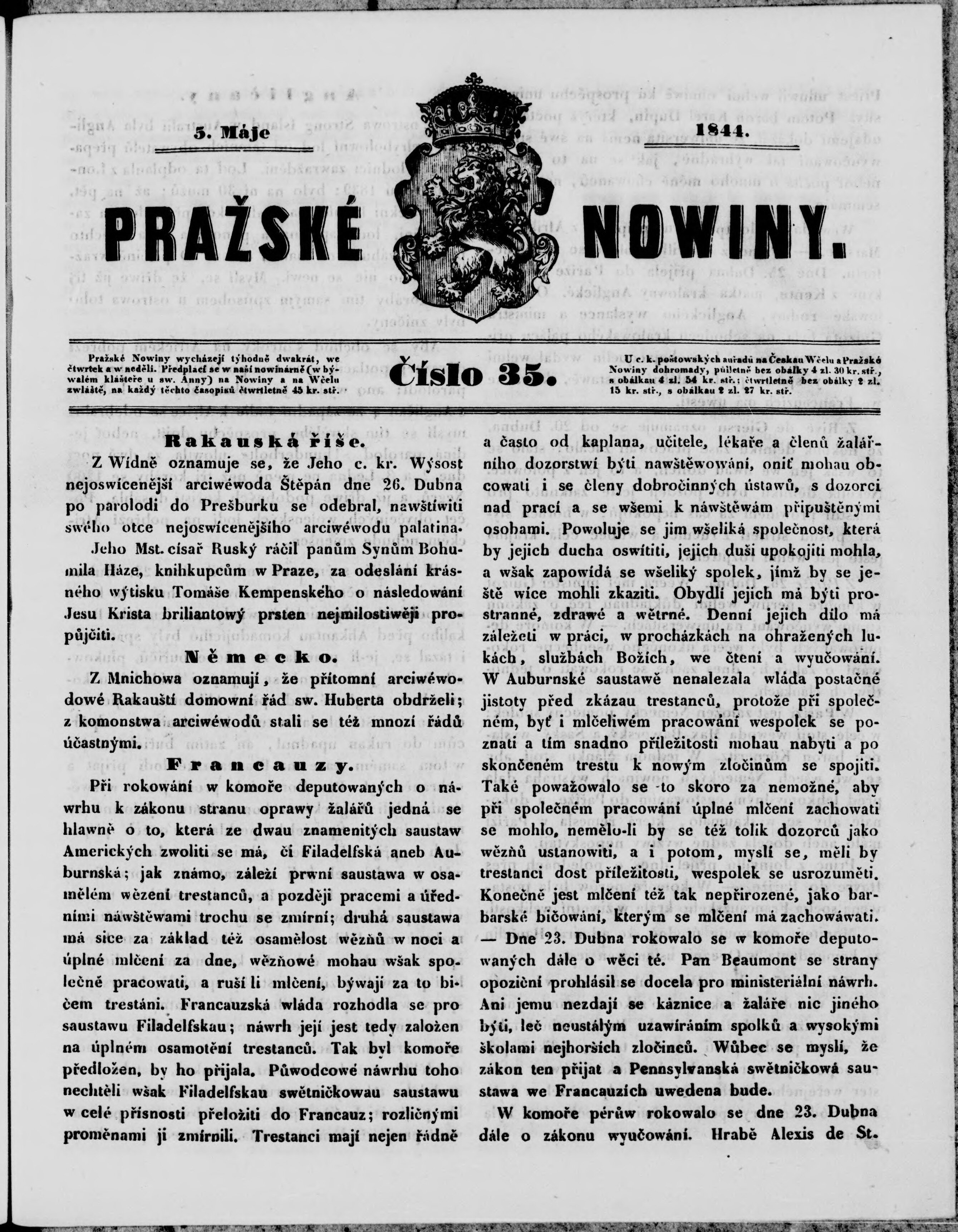 * Datum vydání výtisku: 5.5.1844 Číslo výtisku: 35