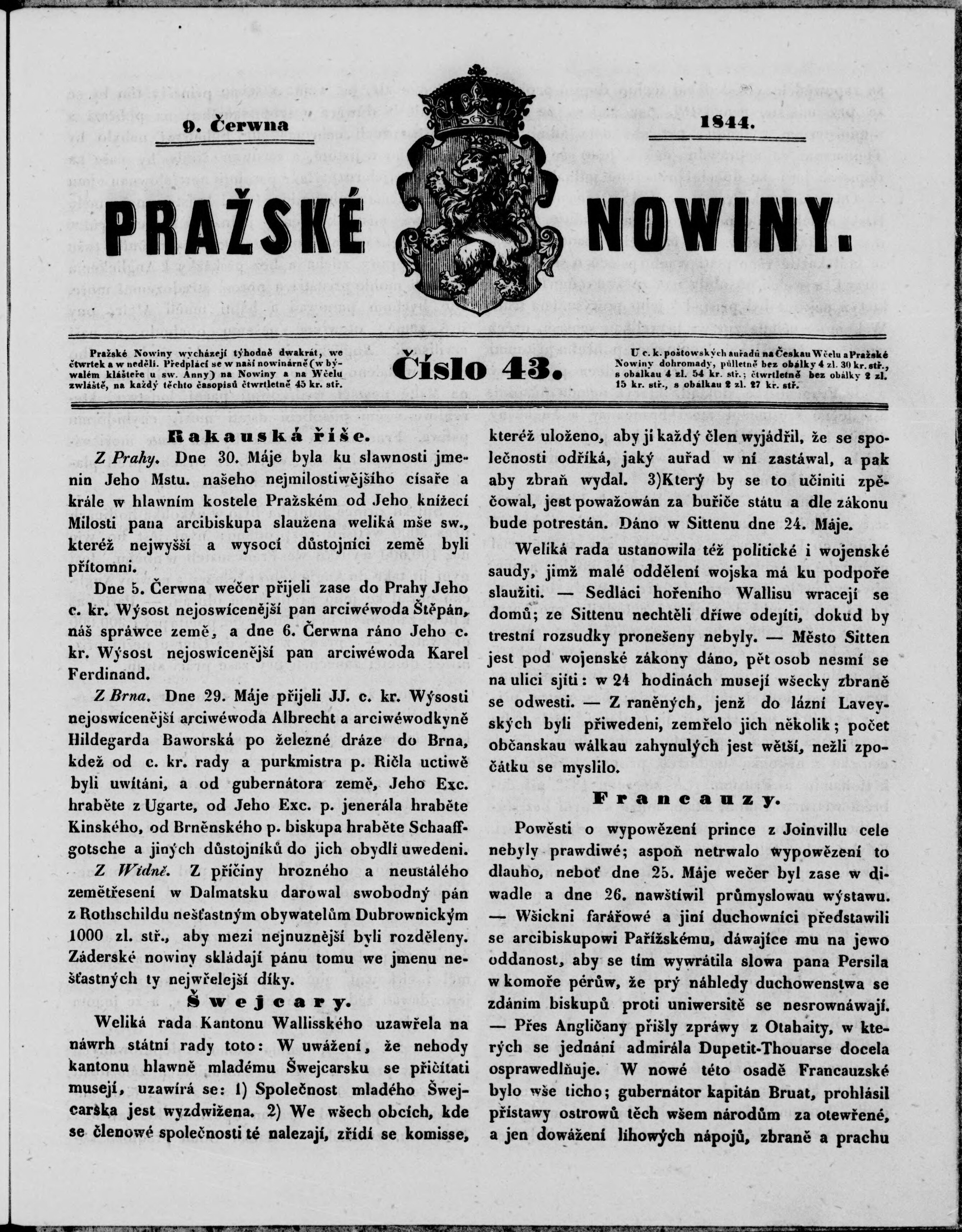 * Datum vydání výtisku: 9.6.1844 Číslo výtisku: 43
