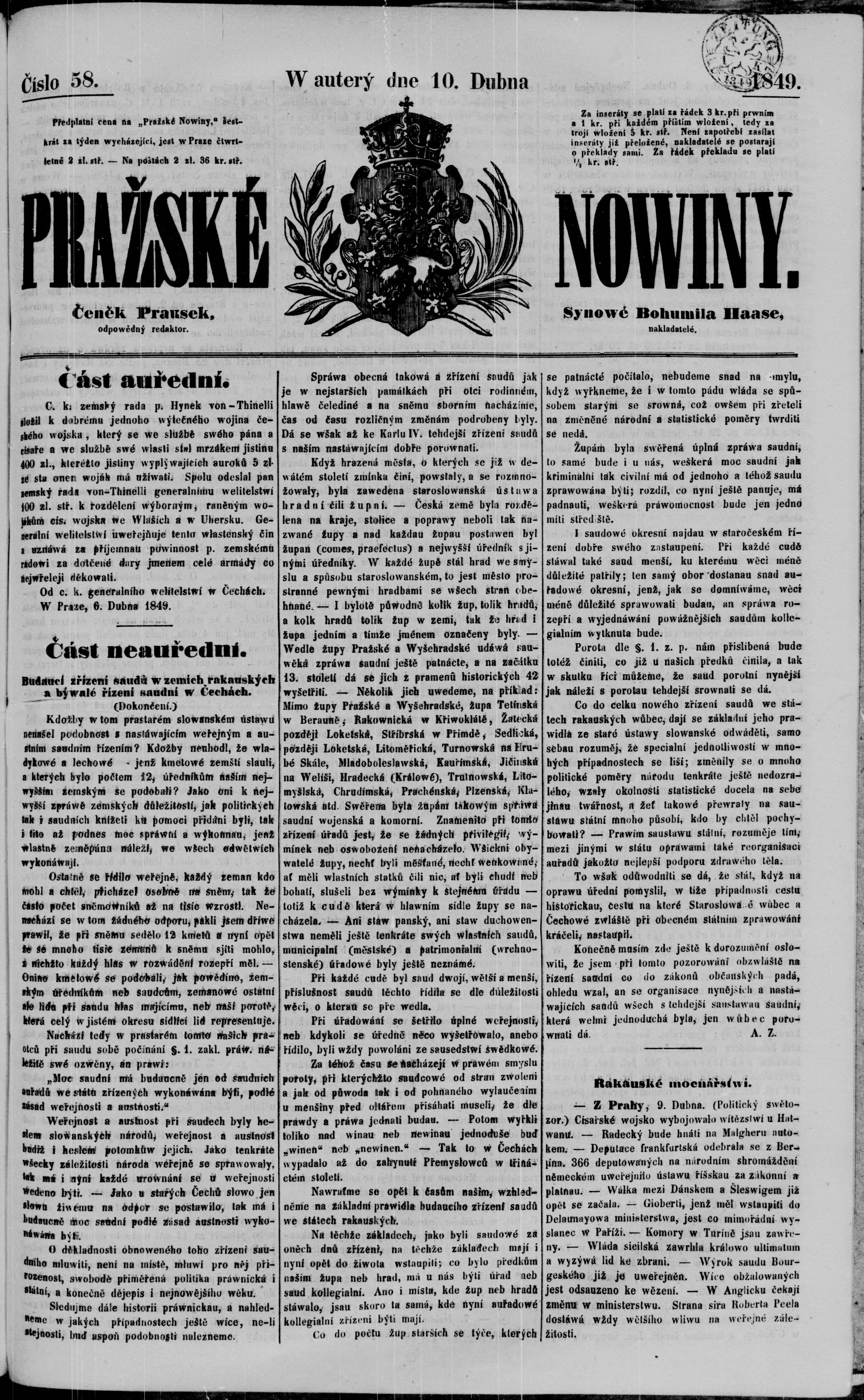 * Datum vydání výtisku: 10.4.1849 Číslo výtisku: 58