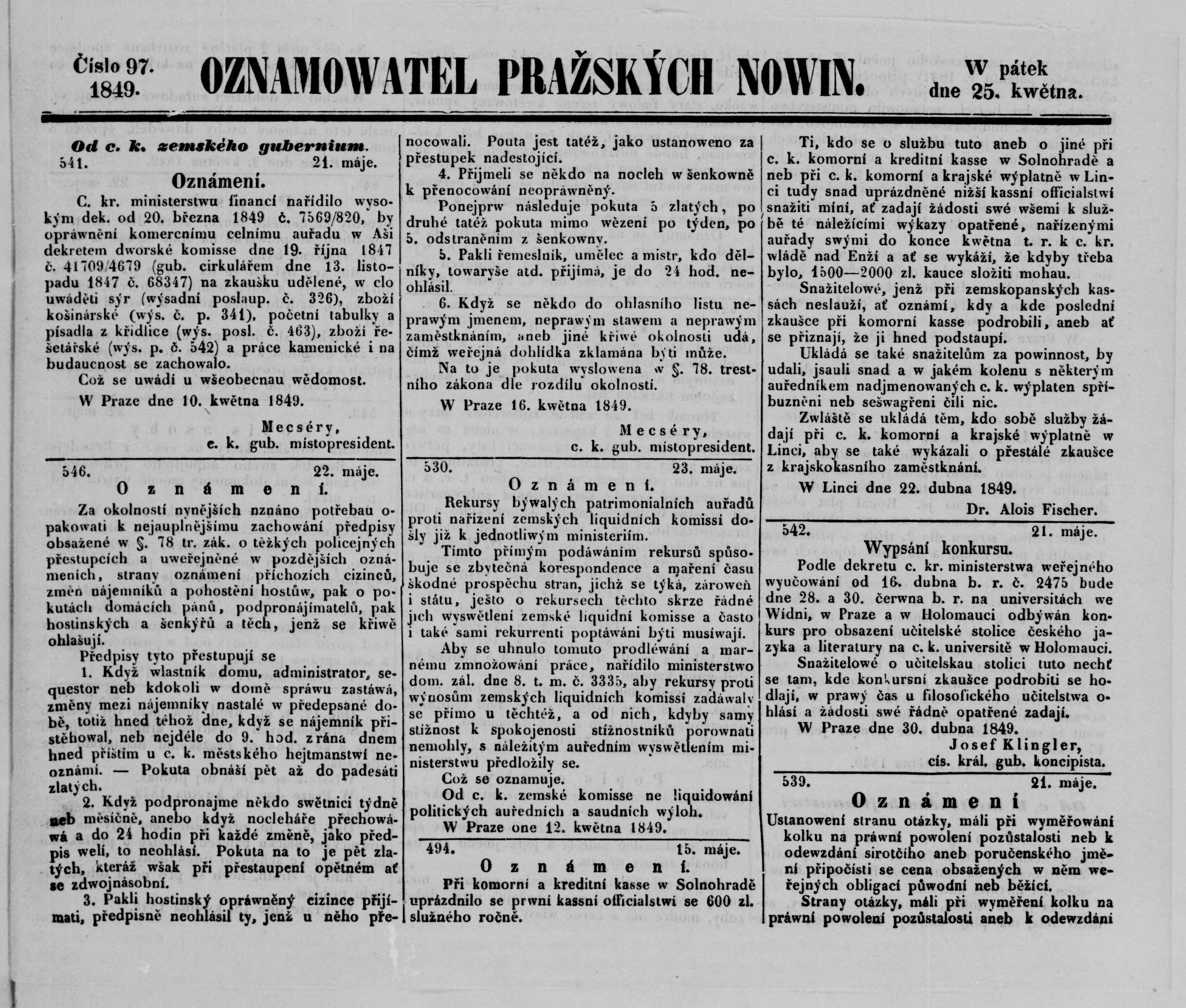 * Datum vydání výtisku: 25.5.1849 Číslo výtisku: 97