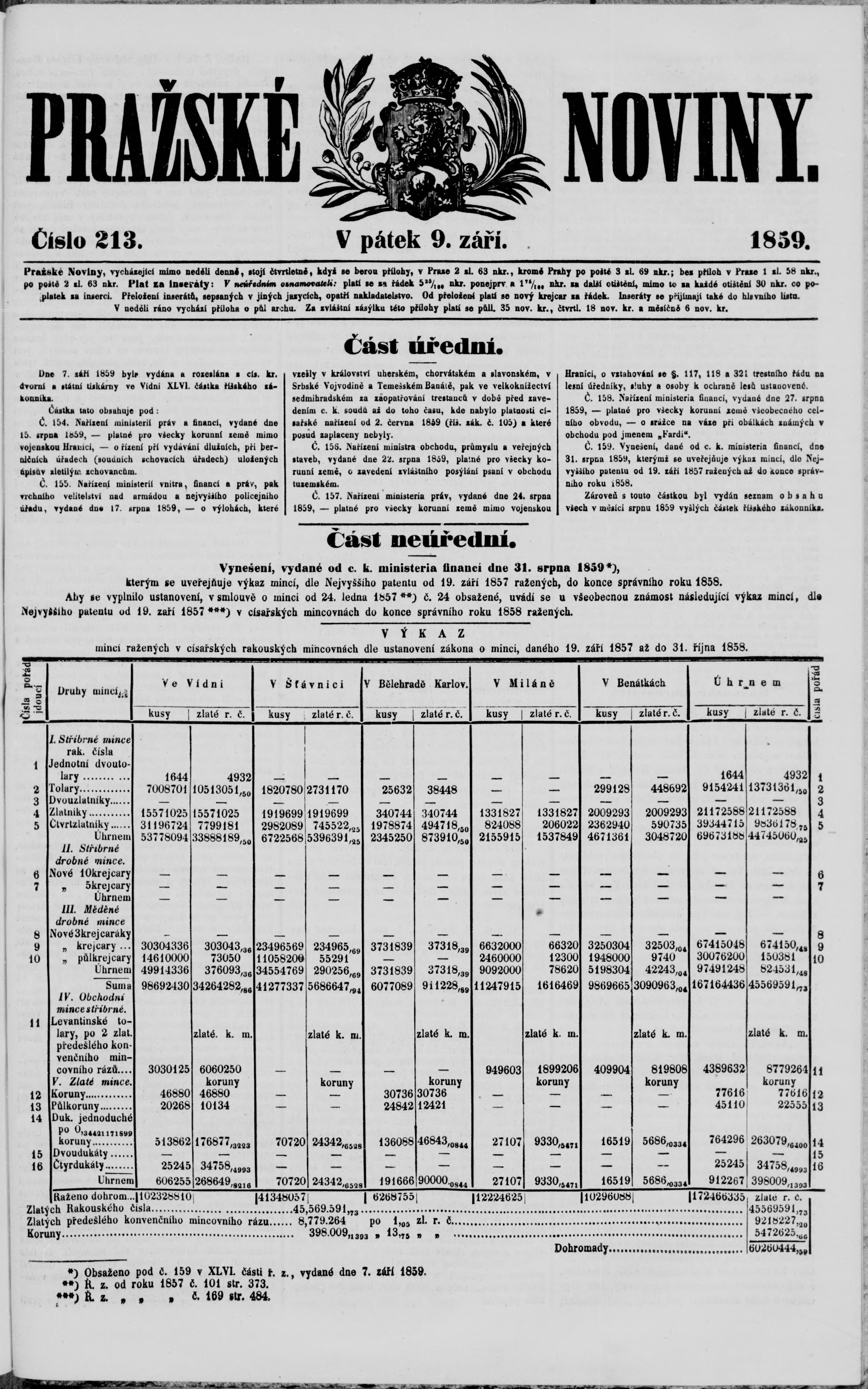 * Datum vydání výtisku: 9.9.1859 Číslo výtisku: 213