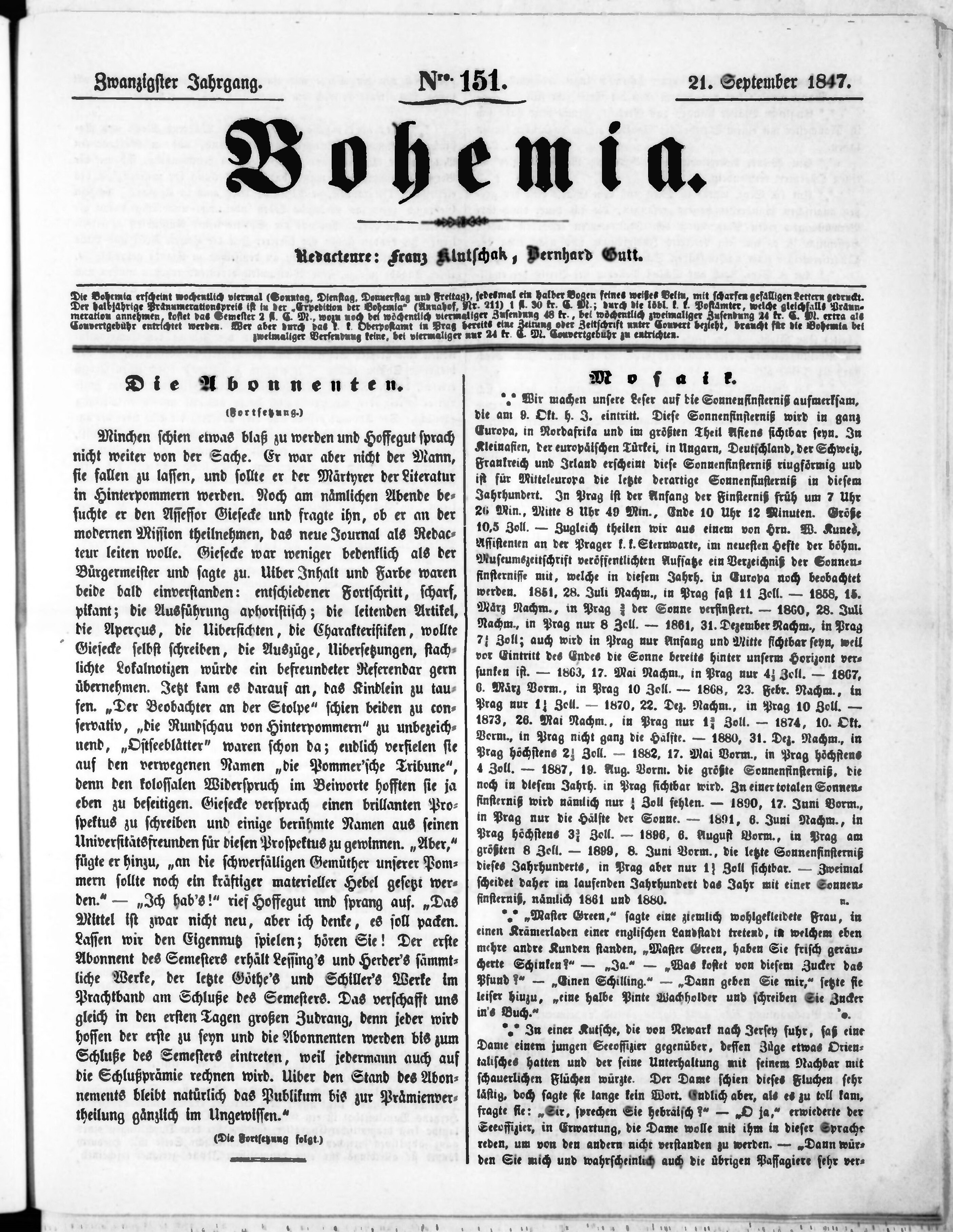 * Datum vydání výtisku: 21.9.1847 Číslo výtisku: 151