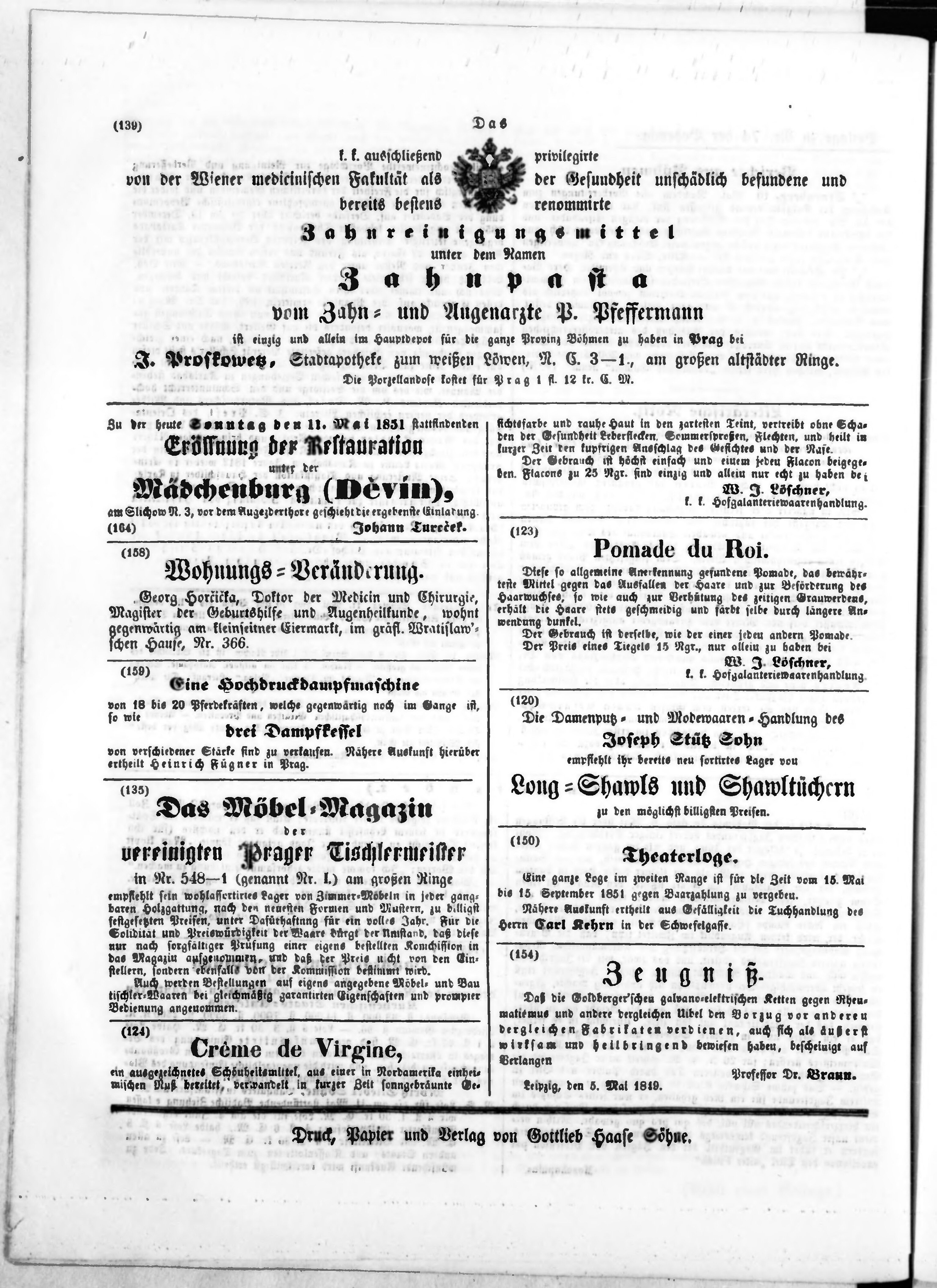 * Datum vydání výtisku: 11.5.1851 Číslo výtisku: 74