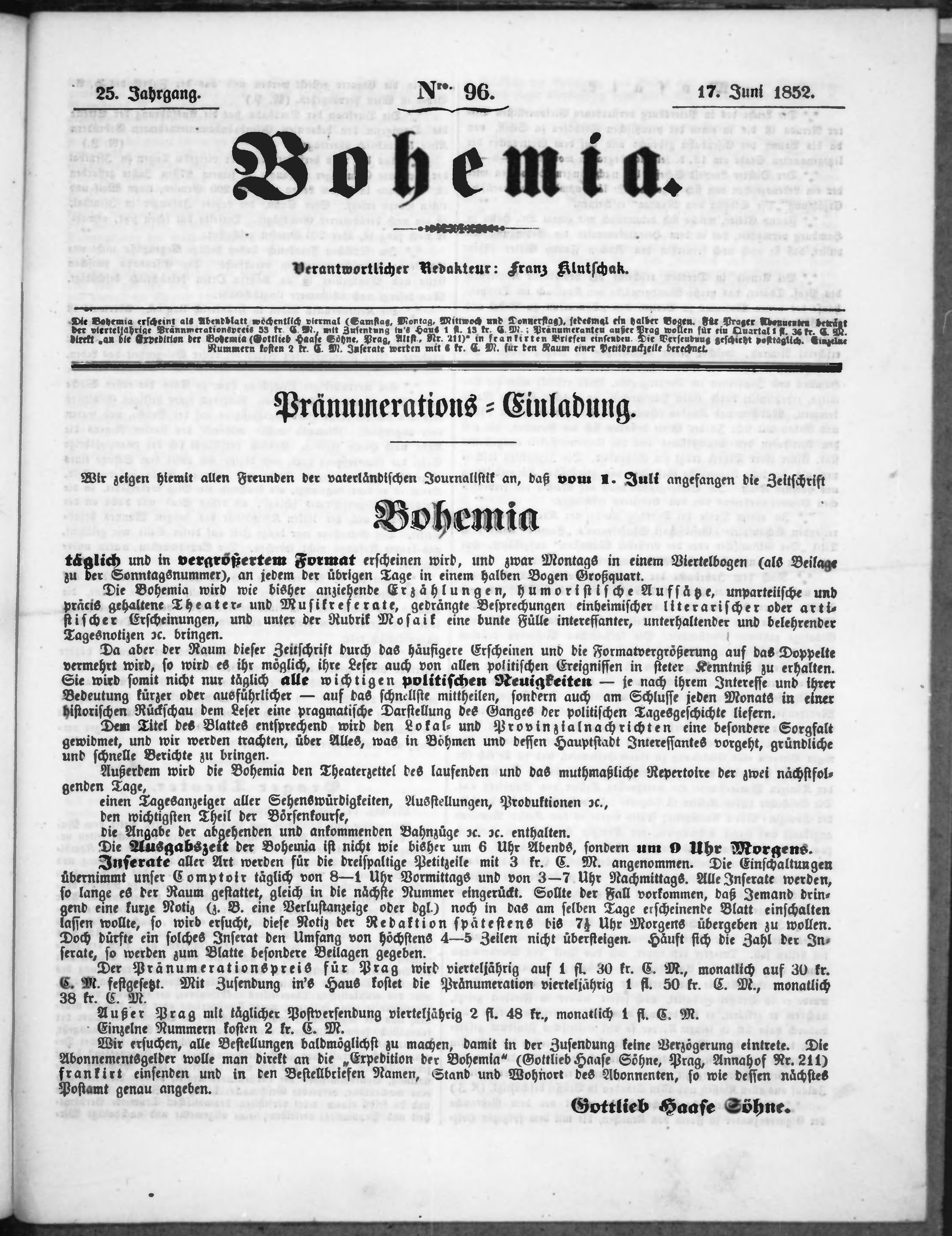 * Datum vydání výtisku: 17.6.1852 Číslo výtisku: 96
