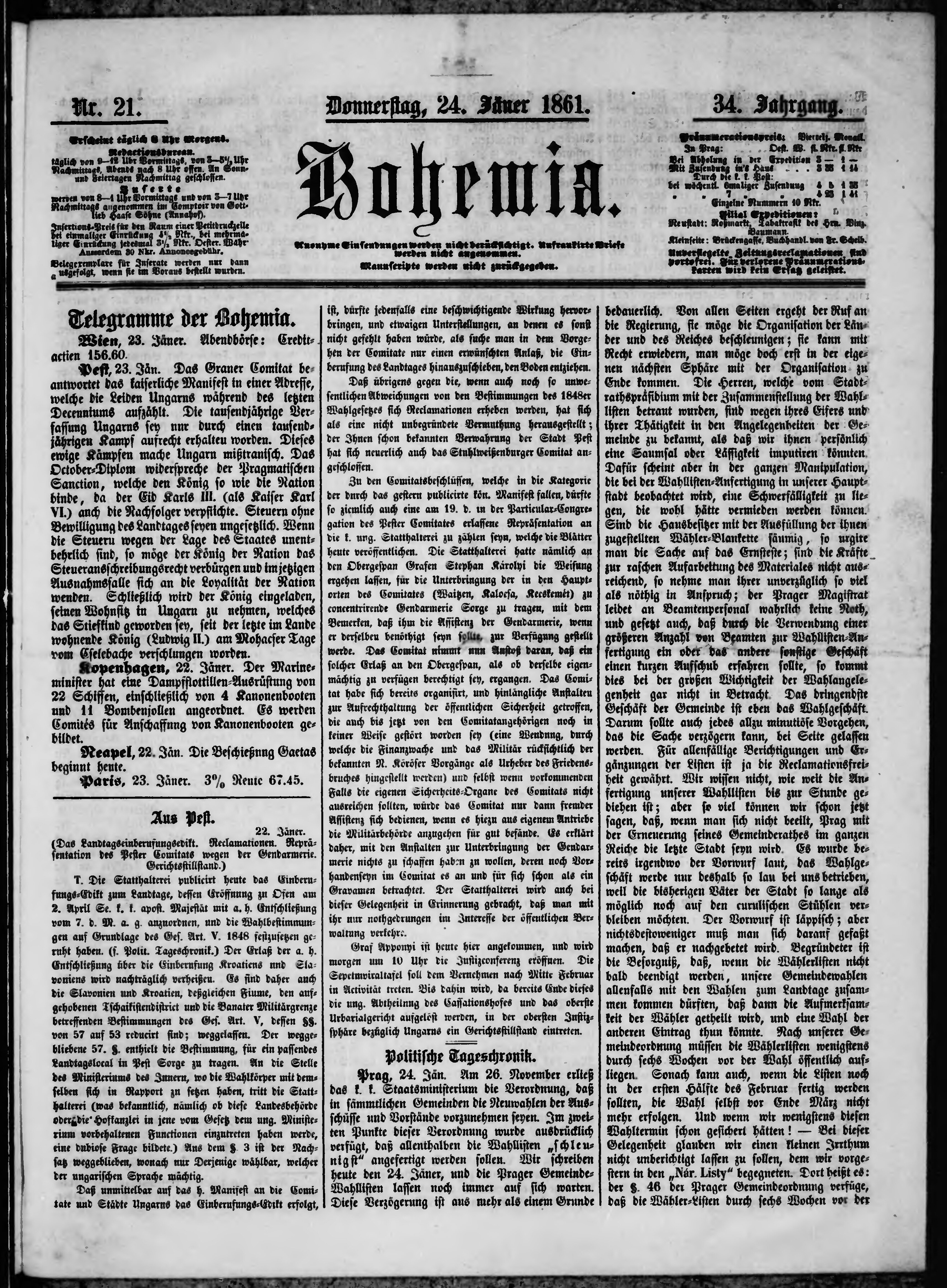 * Datum vydání výtisku: 24.1.1861 Číslo výtisku: 21
