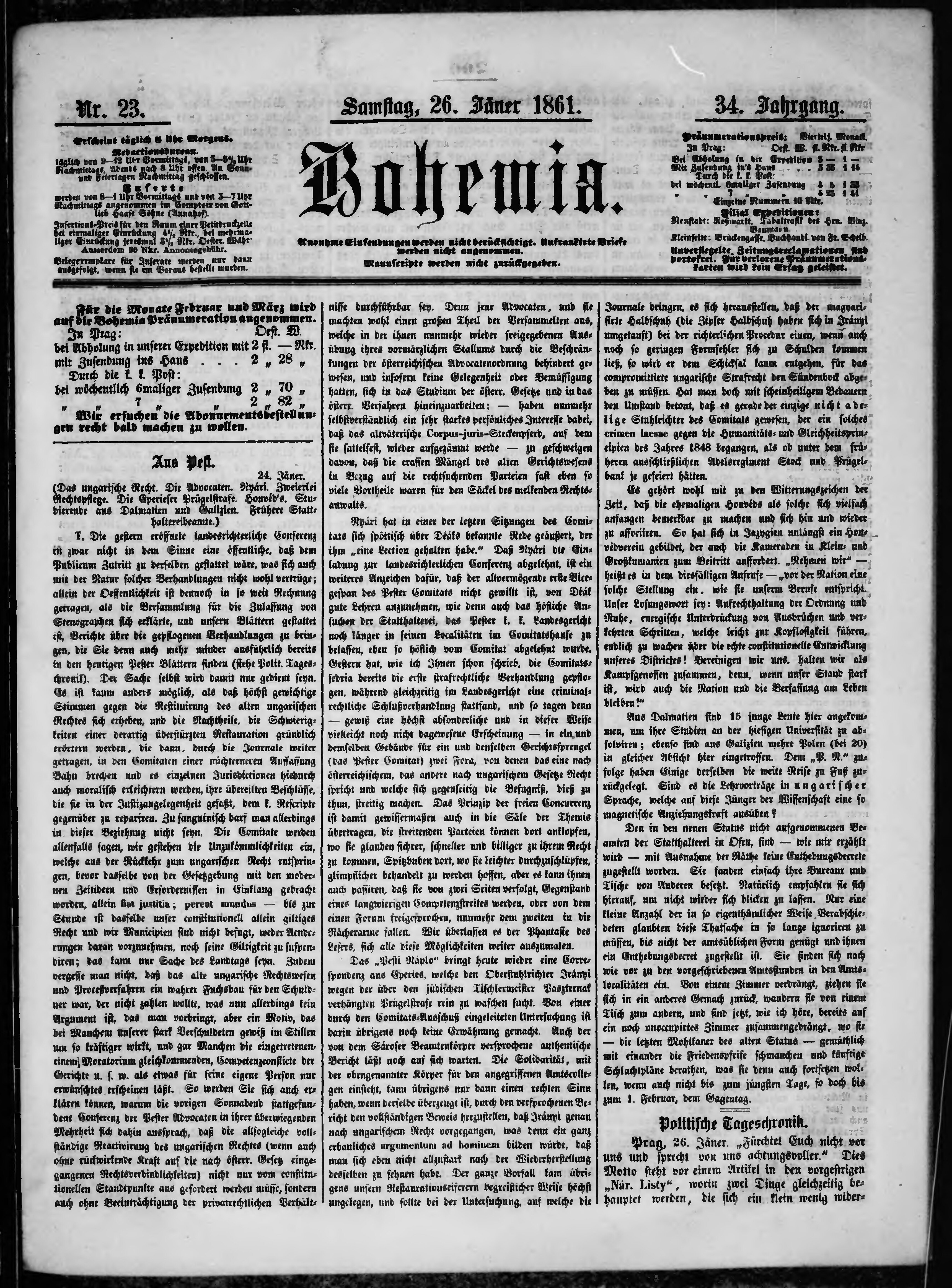 * Datum vydání výtisku: 26.1.1861 Číslo výtisku: 23