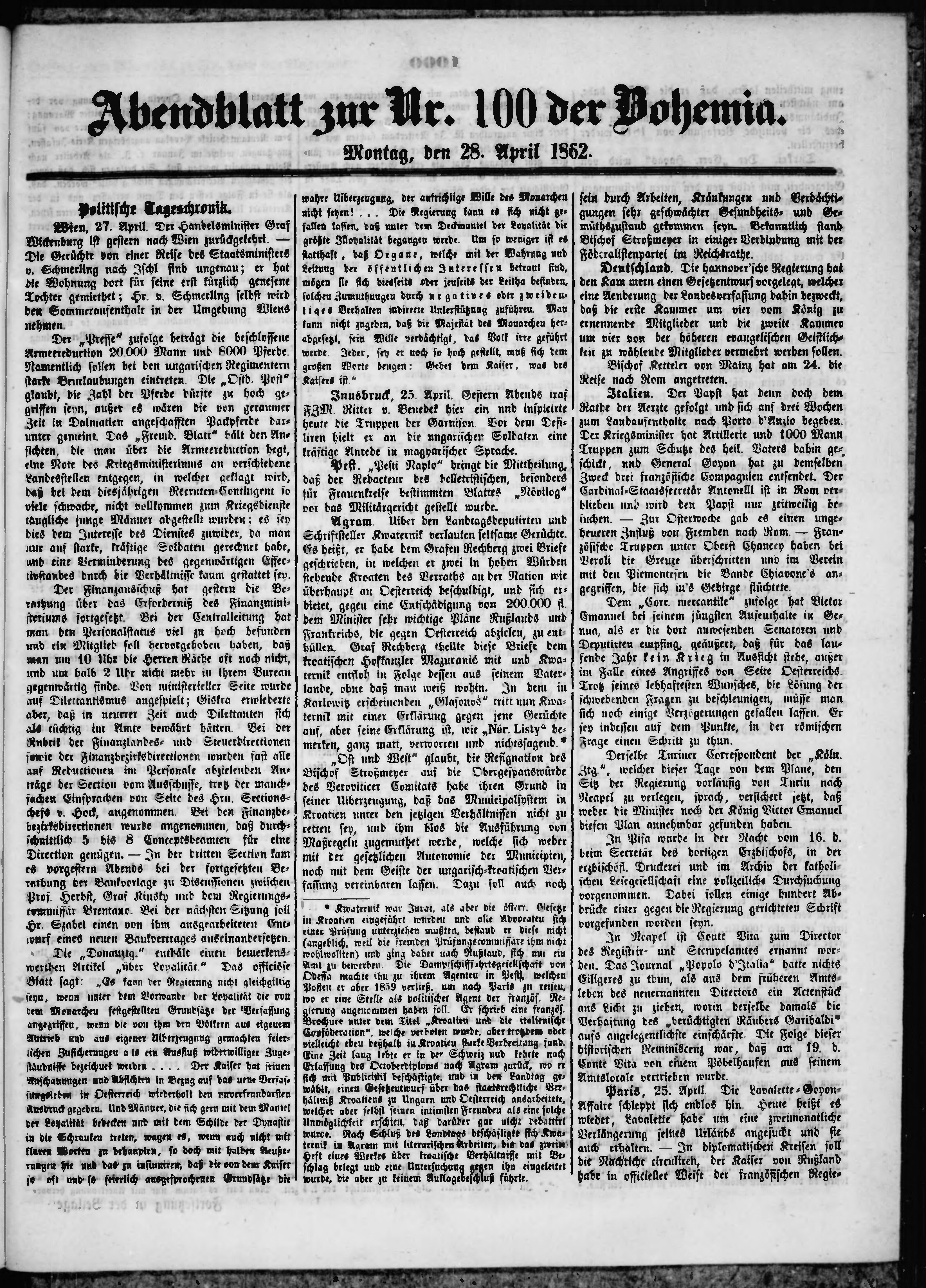 * Datum vydání výtisku: 28.4.1862 Číslo výtisku: 100 Poznámky k výtisku: večerní vydání