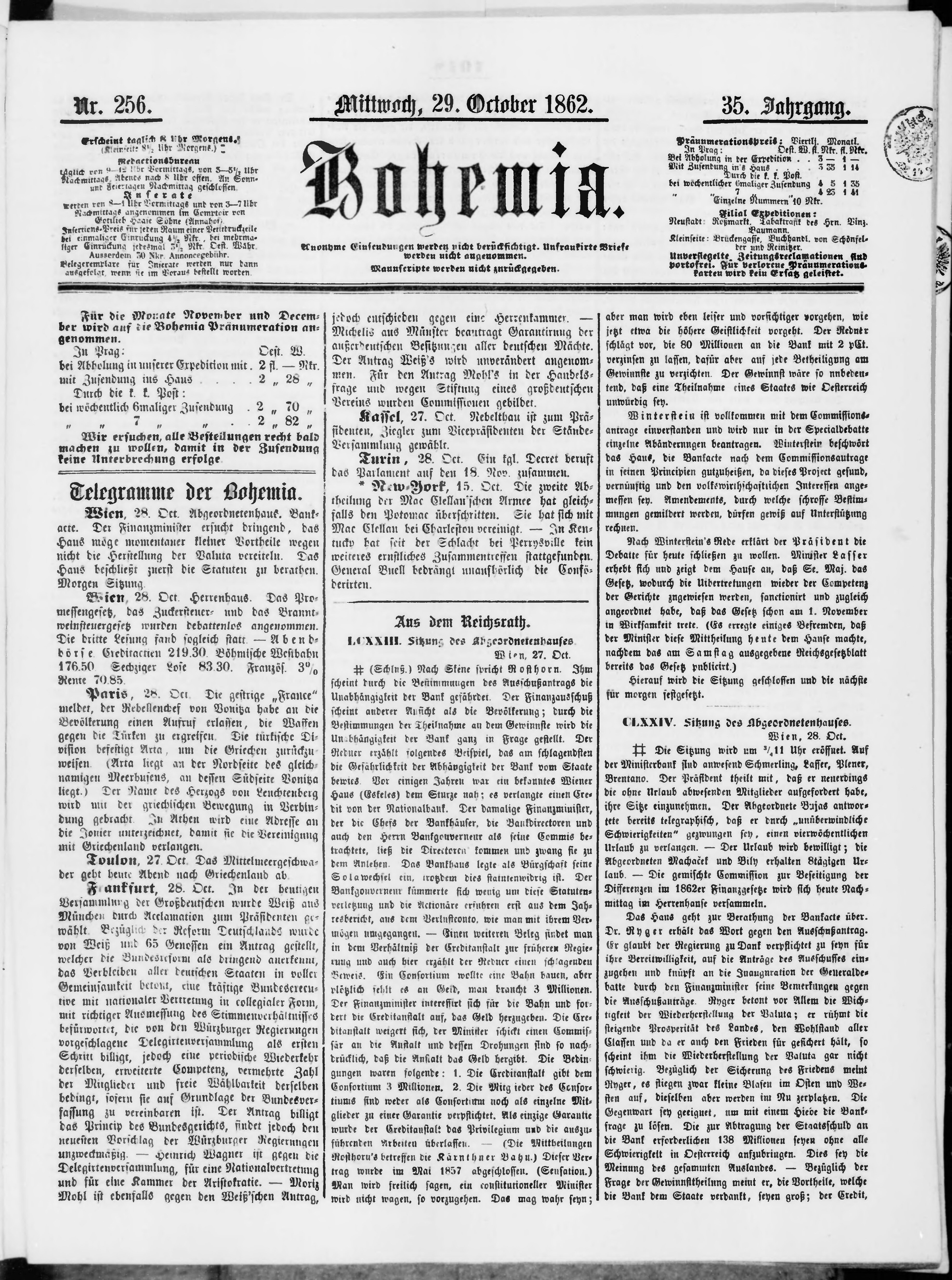 * Datum vydání výtisku: 29.10.1862 Číslo výtisku: 256