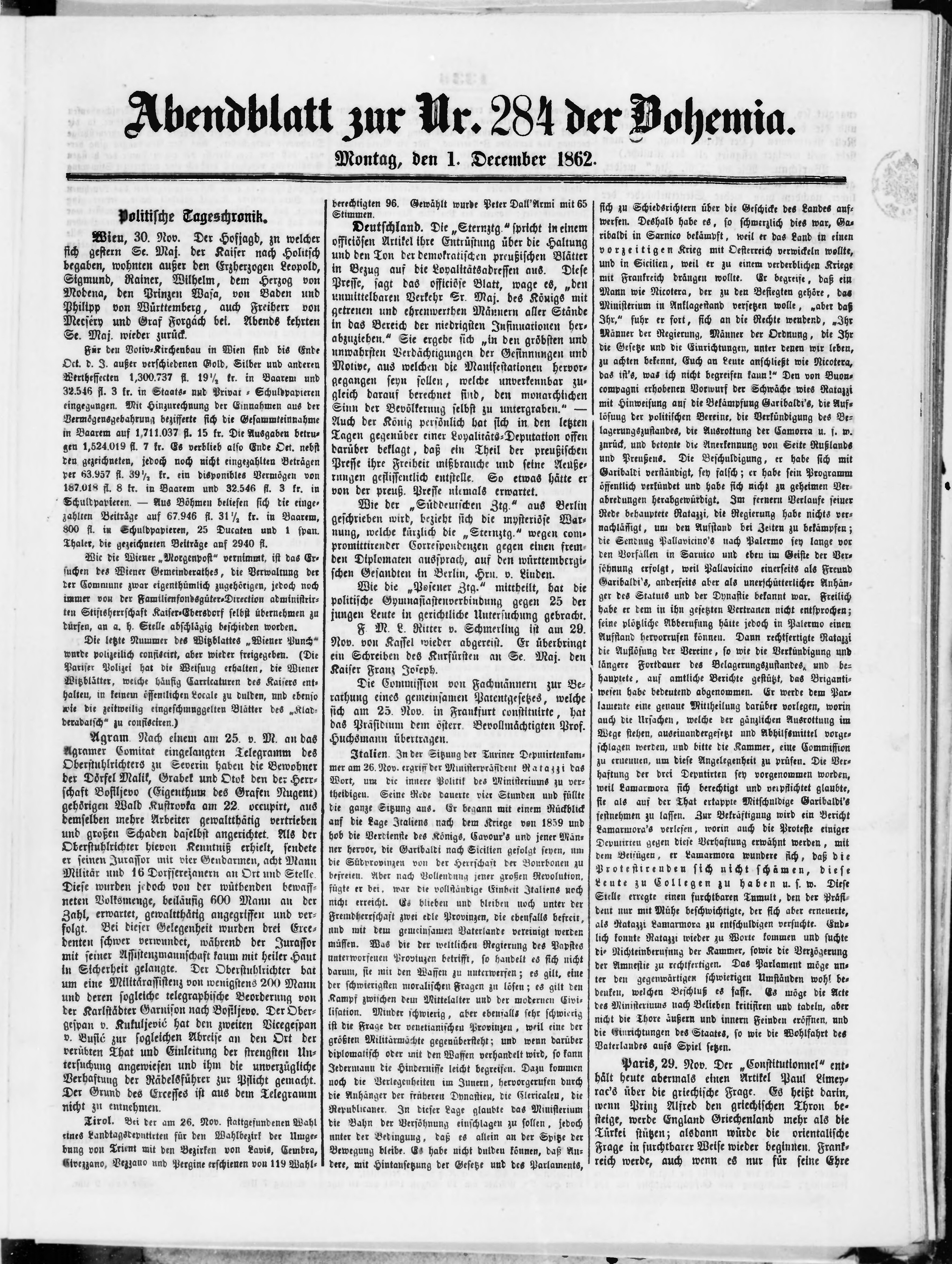 * Datum vydání výtisku: 1.12.1862 Číslo výtisku: 284 Poznámky k výtisku: večerní vydání