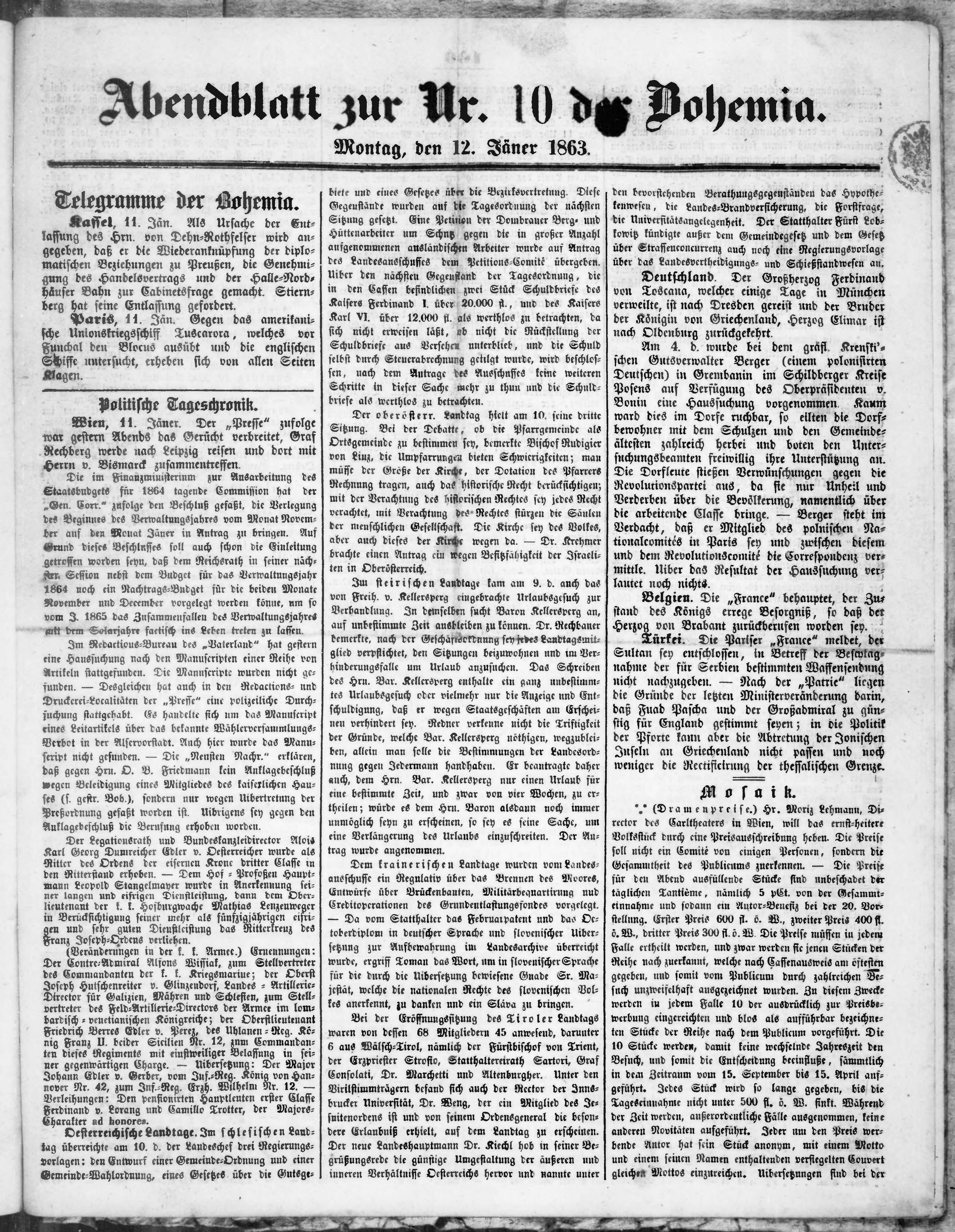 * Datum vydání výtisku: 12.1.1863 Číslo výtisku: 10 Poznámky k výtisku: večerní vydání