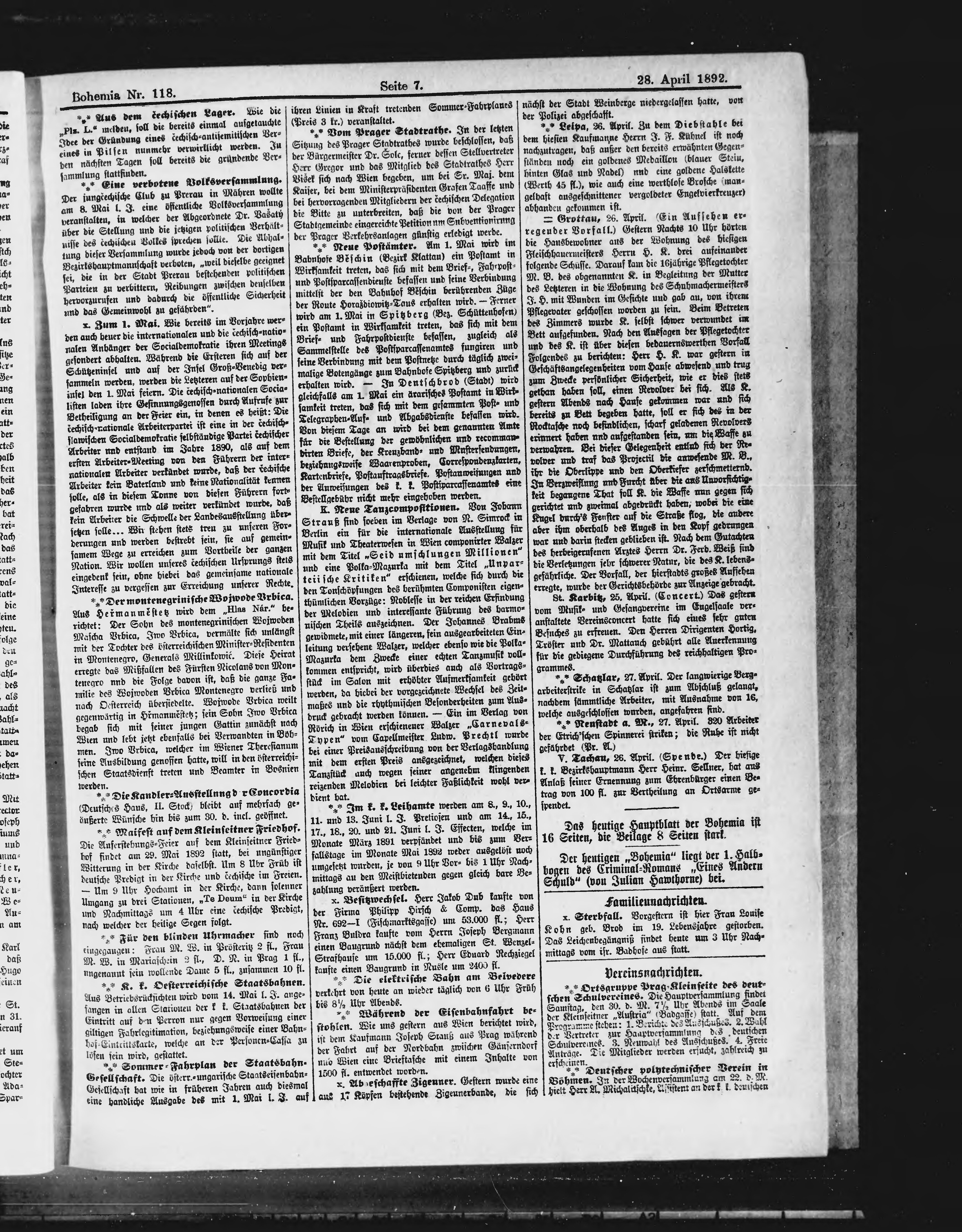 * Datum vydání výtisku: 28.4.1892 Číslo výtisku: 118