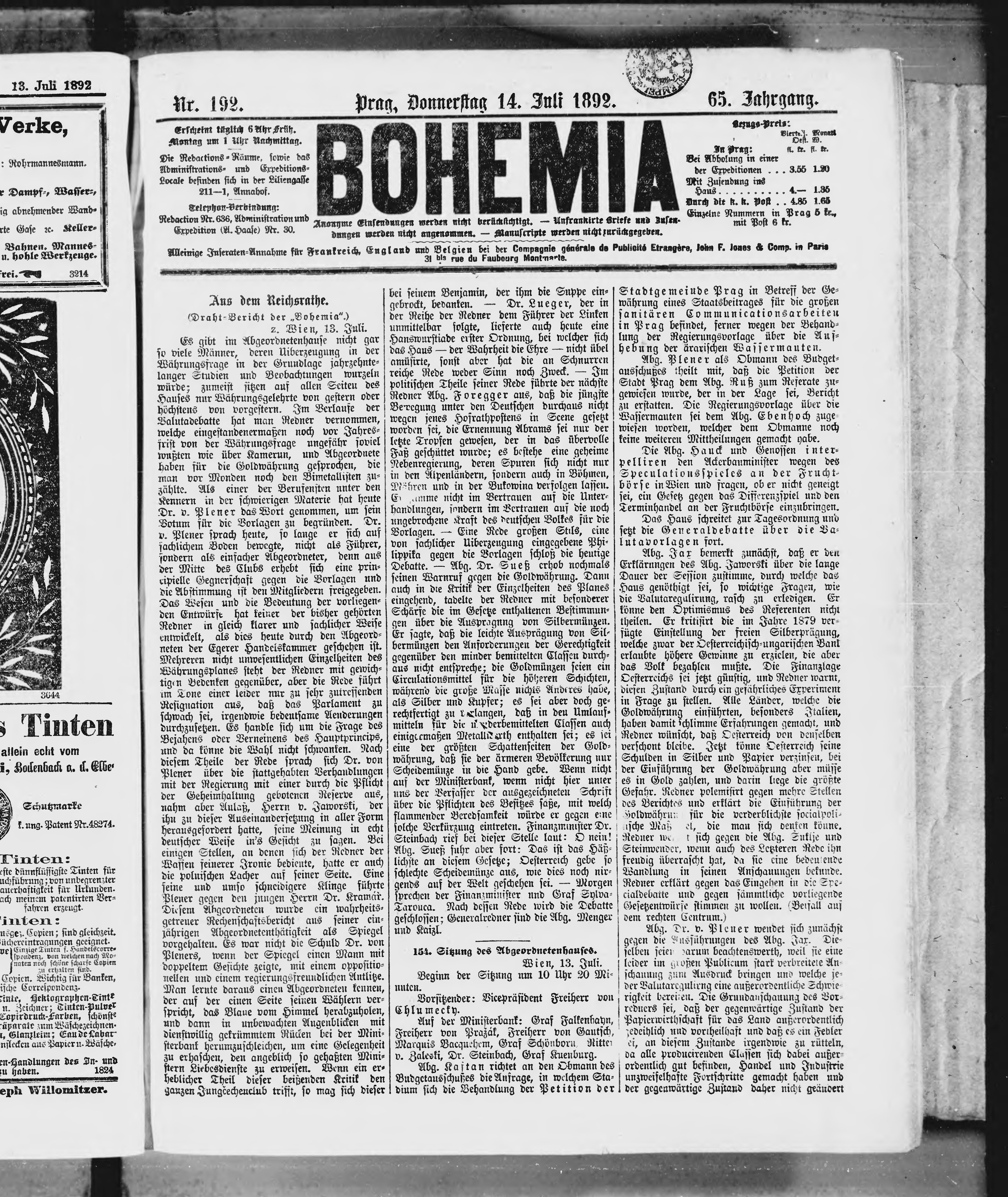 * Datum vydání výtisku: 14.7.1892 Číslo výtisku: 192