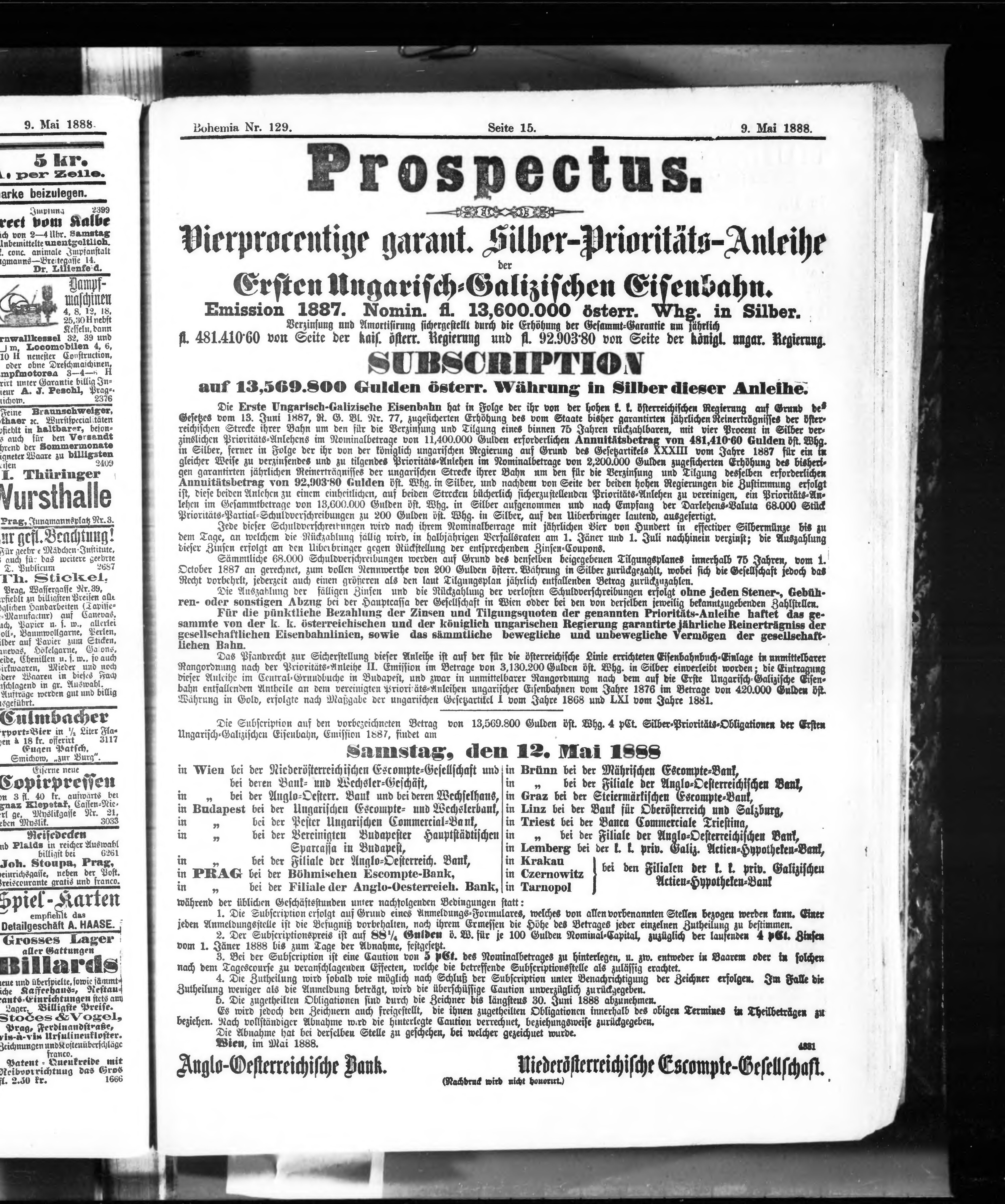 * Datum vydání výtisku: 9.5.1888 Číslo výtisku: 129