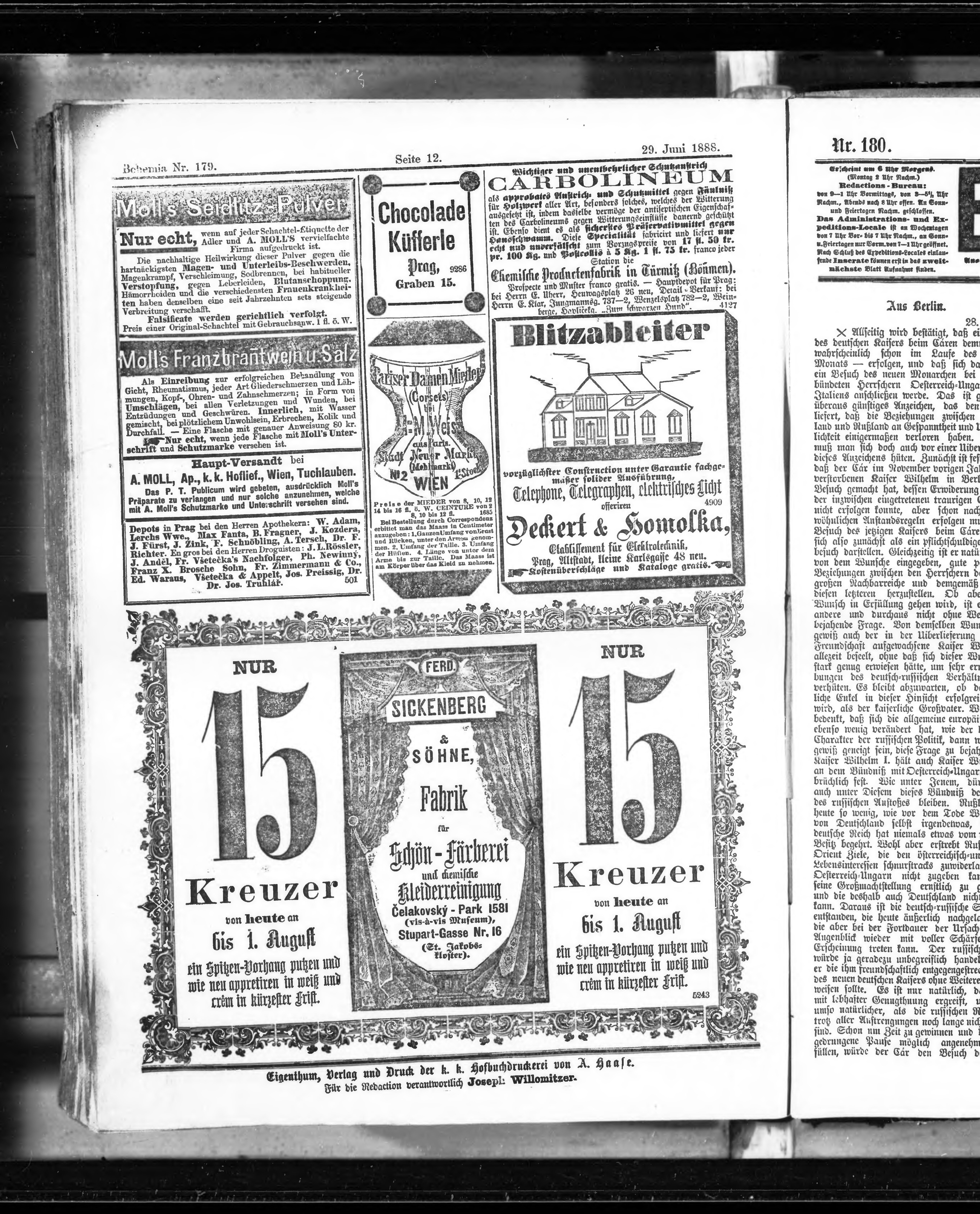 * Datum vydání výtisku: 29.6.1888 Číslo výtisku: 179