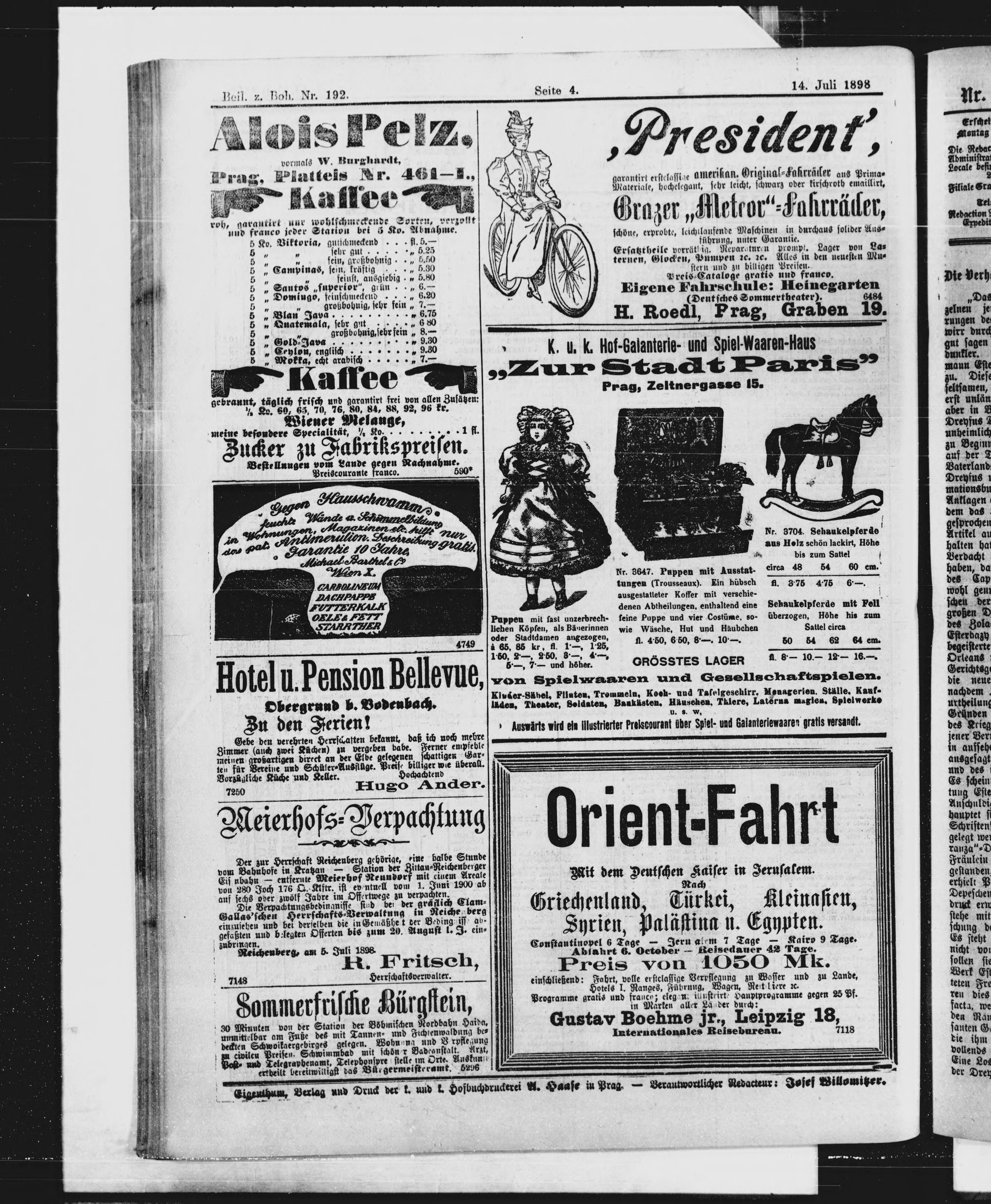 * Datum vydání výtisku: 14.7.1898 Číslo výtisku: 192 Typ výtisku: příloha
